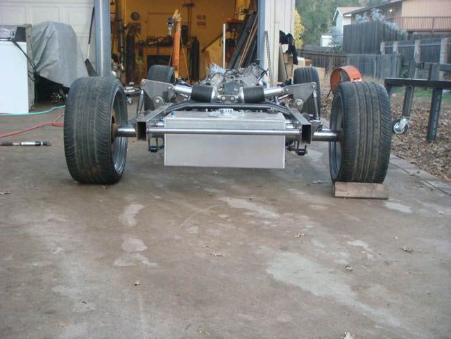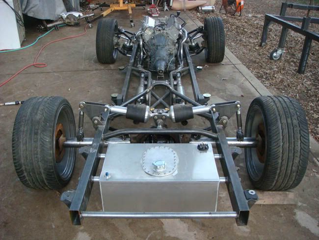 Well i finally got time to take the frame off the frame jig and get it outside. I wanted to see how everything looked and I had to replace the rear end with a pre 69 so my wheels would fit in the bed. Everything lined up perfect. Wheels are centered in both front and rear fenders, all of my bed mounts were really easy to line up and bolt together. I am stoked. Now i was going to figure out how i am going to run the rest of the exhaust. I am hoping to make a custom exhaust fitting that matches the contour of the rear roll pan. I also remade the gas tank and this time i ran the solid alluminum bracing all the way from side to side. Much stronger overall. I still have to weld the top cover part to the gas tank but left it unwelded until I figure out a clean way to run the electrical into the tank for the pump.
