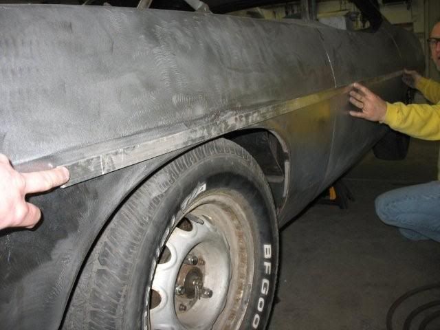 http://i229.photobucket.com/albums/e...ewallpiece.jpg Chris filled the rear seam..welded it when the panels didnt real line up and then ground the hell out of it. The metal was so thin Tim could crack it with his finger..... http://i229.photobucket.com/albums/e...sengerside.jpg Its gets better...... with all the sheetmetal work and heat he put into the front end with all the overzealous MIG work, the front driver side corner warped upward about half an inch !! When Tim cut all the junk out it actually sprang back down to where it should be.... Tim is gonna get it all lined up right.... http://i229.photobucket.com/albums/e...tmockup017.jpg |