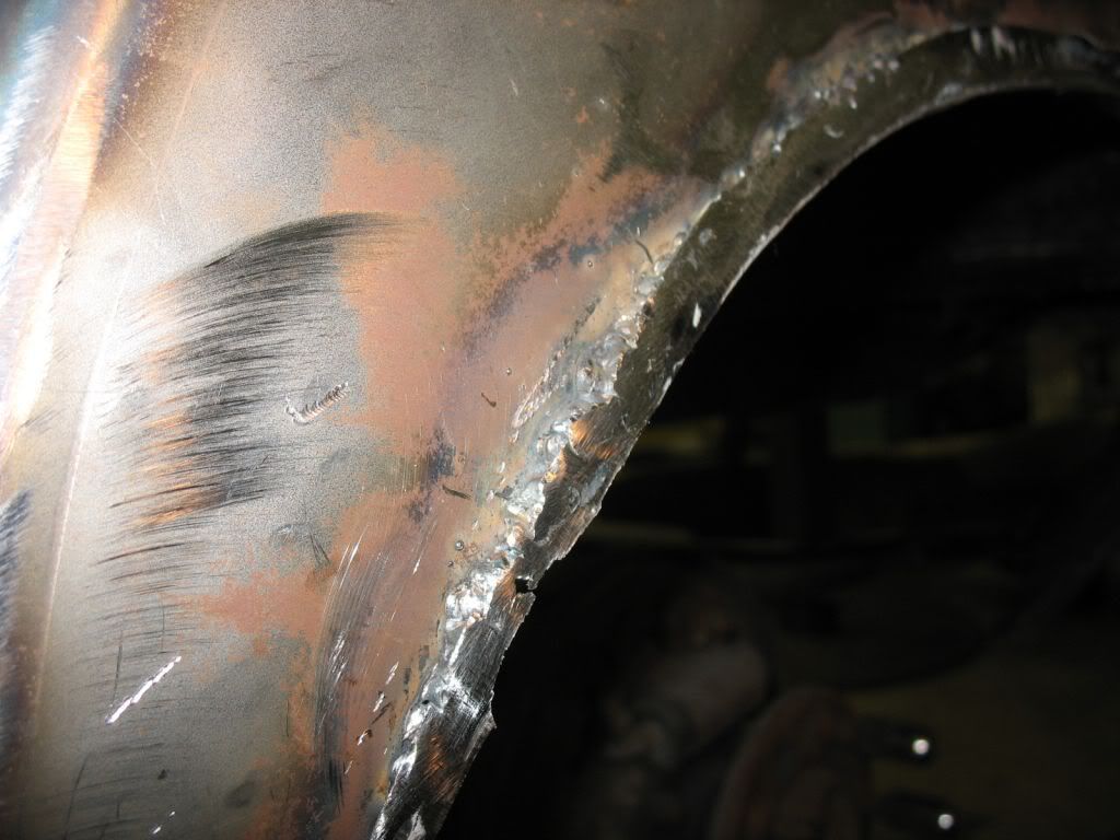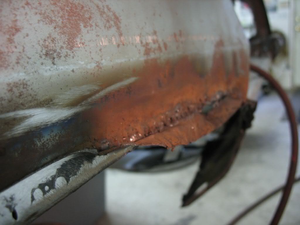 Tim used silicon bronze filler on some of the thin areas around the quarter skin. The patch was fit and fusion tacked in place. Very little filler rod was needed. The upper section above that patch was also replaced right below the window area. |