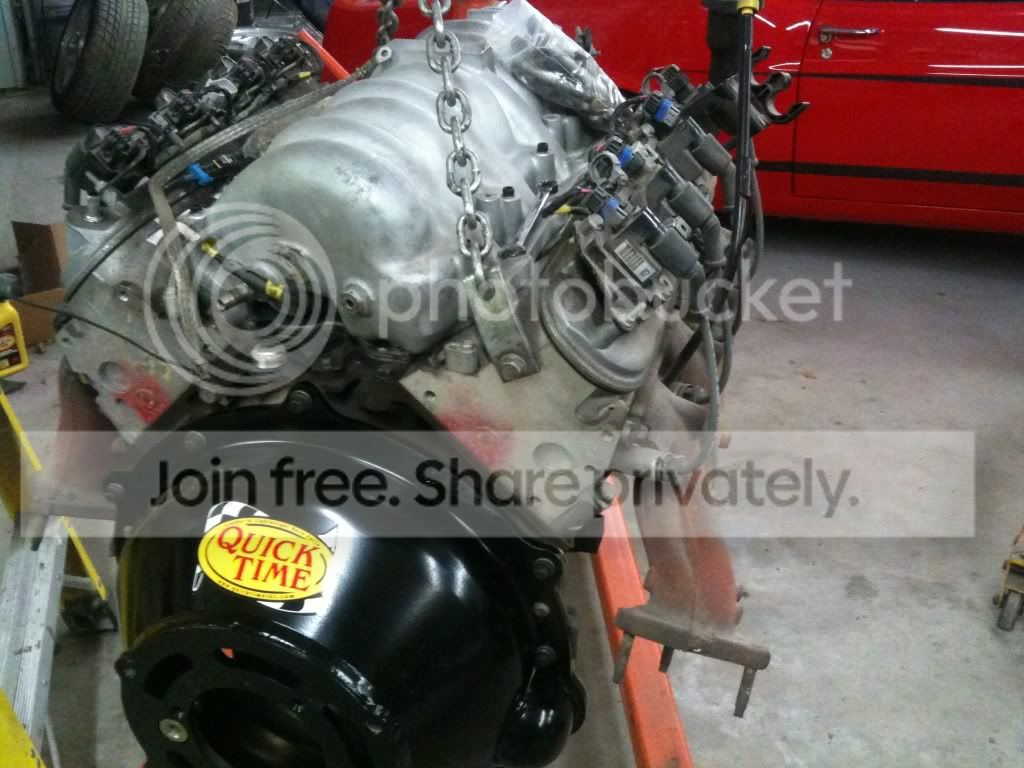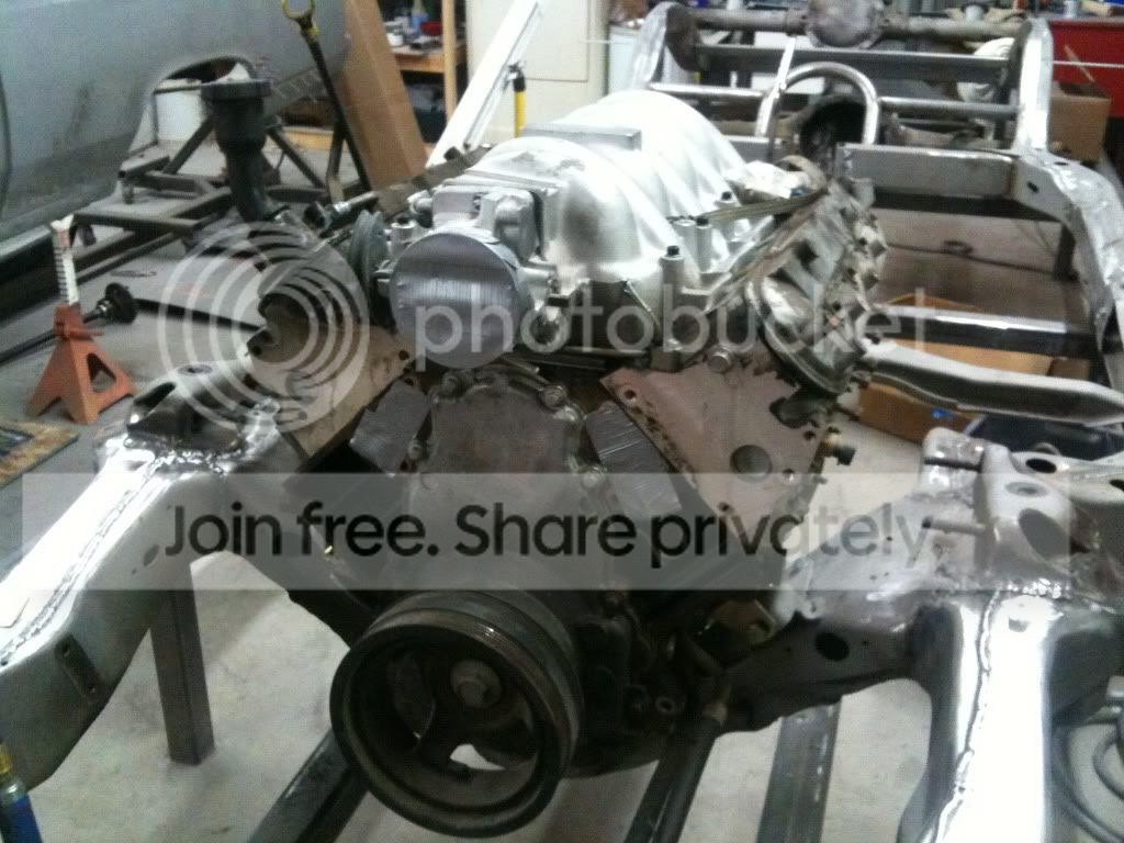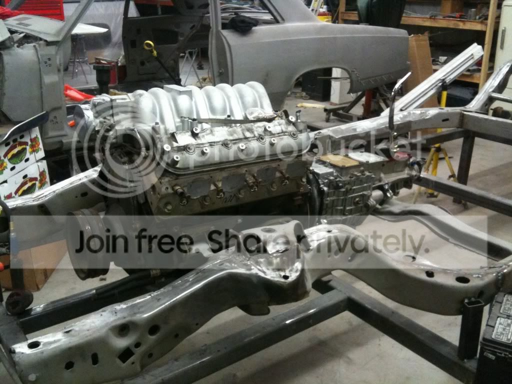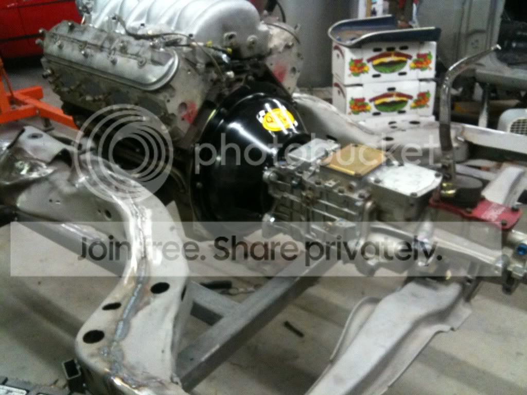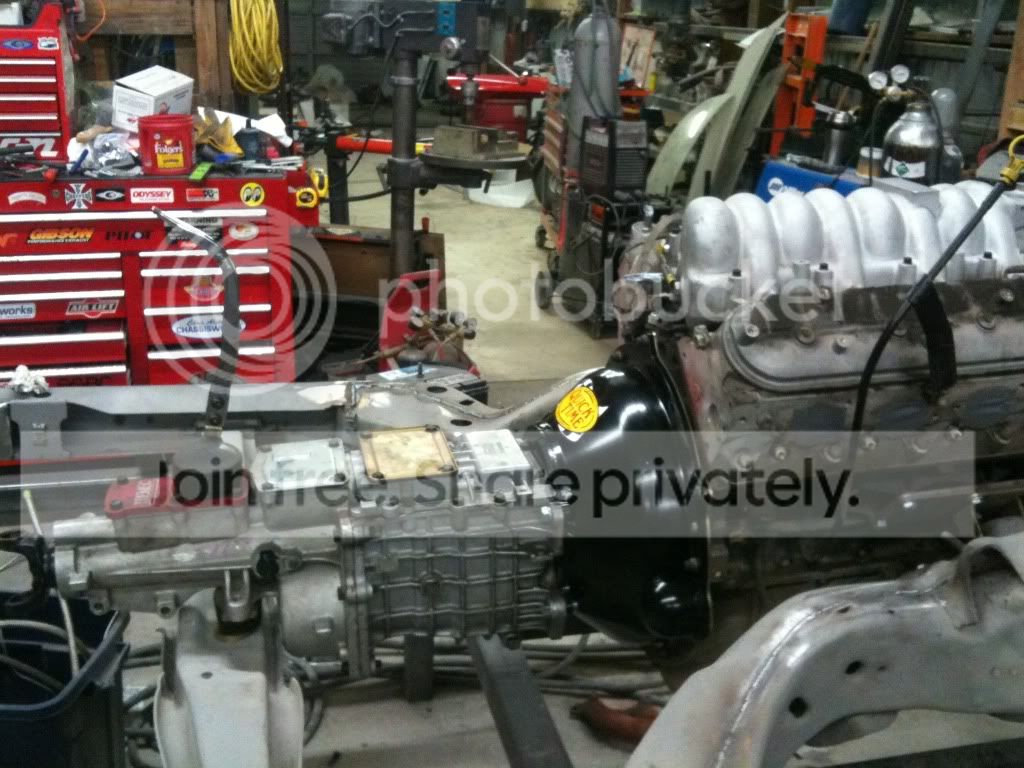 Well a small update. I picked up (feel like I stole it) a barely used tko600 off of CL a few weeks ago and ordered up a quicktime bell and so I decided to pull my 6.0l off the crate and tear all the truck acc off and put on my used weiand intake on and set them up in the chassis for some motivation. I'm gonna try and spend a little time on it after I get back from sema. I am trying to finish up a 69 chevelle resto I have to have finished in 2 weeks to deliver back to the customer down in cali on my way to Vegas so I wont have much free time to spend on it until then but it sure is hard not work on it now that I am finally making some progress.