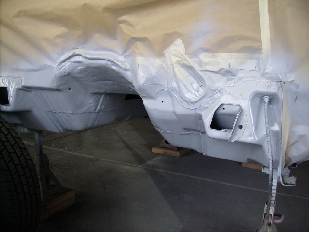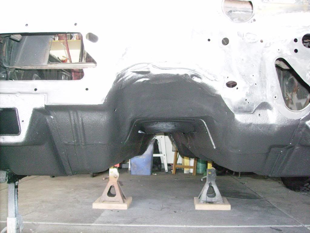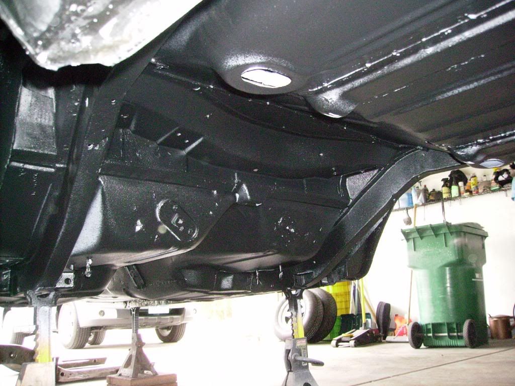 Some updates. I finished cleaning up the underside. I used Dupont epoxy primer and followed up with Raptor truck bed liner. I also got the sub-frame apart, cleaned up, and all seams welded solid. It's at the powdercoaters right now, I should be getting it back today. Here are the pics.....