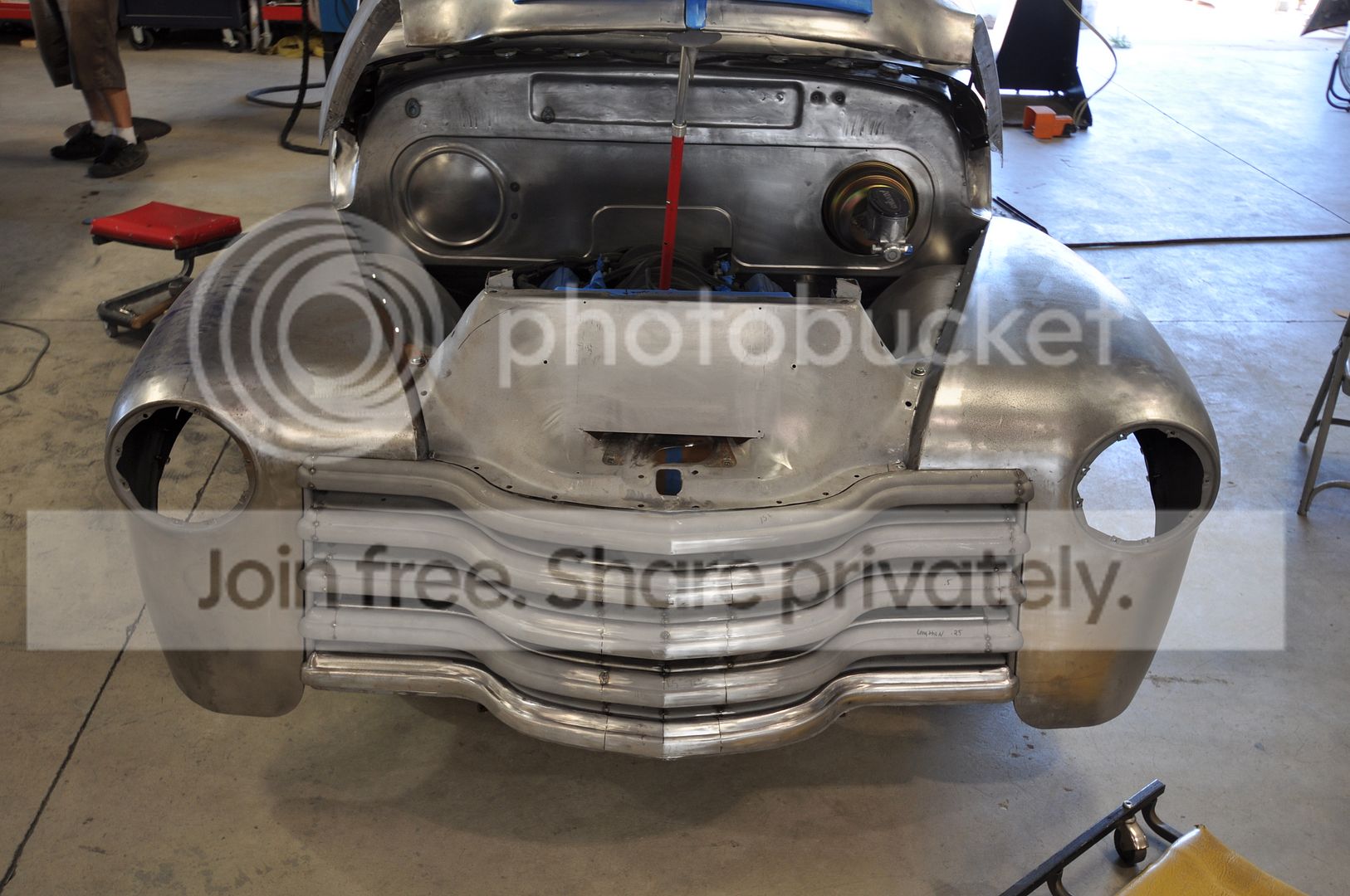 http://i616.photobucket.com/albums/t...une2010076.jpg Nothing like a blower from Magnuson to fill that empty space above the engine. We are adapting it to work with the Vintage Air Frontrunner. http://i616.photobucket.com/albums/t...uly2010012.jpg http://i616.photobucket.com/albums/t...uly2010011.jpg A shot of the heavily modified grille, we took 1" off each side of the grille to narrow it up. You would not believe how much work that is. http://i616.photobucket.com/albums/t...e2010105-1.jpg A shot of the rear bumper. It is a sectioned and narrowed 67 chevy truck bumper. It looks really nice on the back. We are starting on the tailgate mods currently. http://i616.photobucket.com/albums/t...uly2010015.jpg Here is a shot of the under dash AC vents we made to hang under the dash. We do plan to change the vents, to something more period correct. http://i616.photobucket.com/albums/t...une2010031.jpg I just want to thank Frank for allowing us to build a pretty crazy truck to the best of our ability. I can say there is not one thing I would change on this truck. Frank and I have had such similar taste on design you would think he wore gray Dickies everyday to work....:D It also looks like we have a spot for SEMA, just waiting for the official word. |