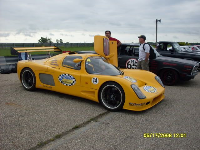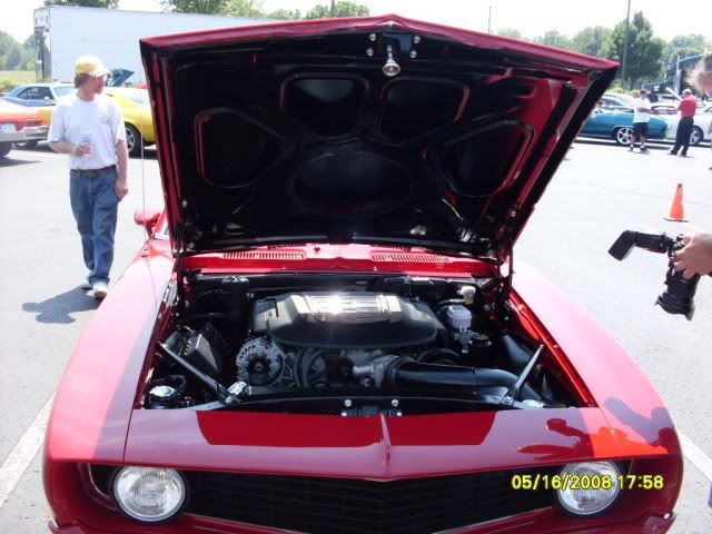 In the picture of the Chevelle smoking the tires you can see the tire marks where Dave Michaels made his first pass frying the tires just about all the way down the front straight. That is Dave in the reflection photo with Stielow. The Chevelle is Brian Thomsons. Brian built Stielow's engine. His company is www.thomsonengines.com and he is a perfectionist when it comes to engines. His Chevelle is basically a LS9 but 454 inches. It makes 900 ft pounds of torque and 850 hp and it idles at 650 rpm. I think the 900 ft lbs was at 3400 rpm. He drove it on all of Power Tour then drove it to Motorstates. Has done a bunch of development work for GM. The June issue of Hot Rod features a 800 HP LS7 that he built. One of the really nice guys in the industry that I am happy to call a friend.:cheers: