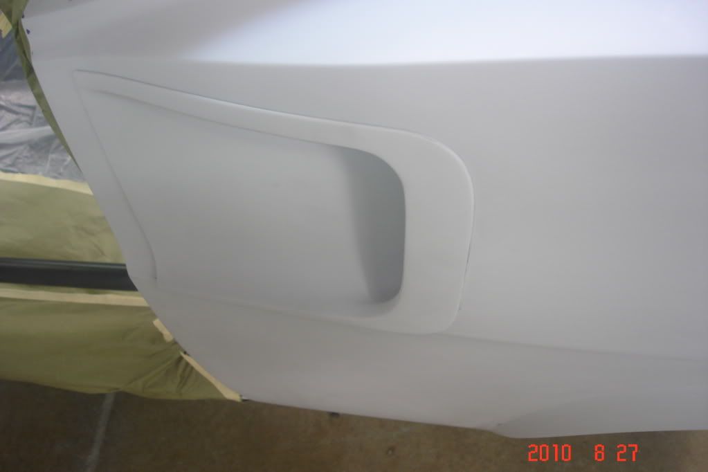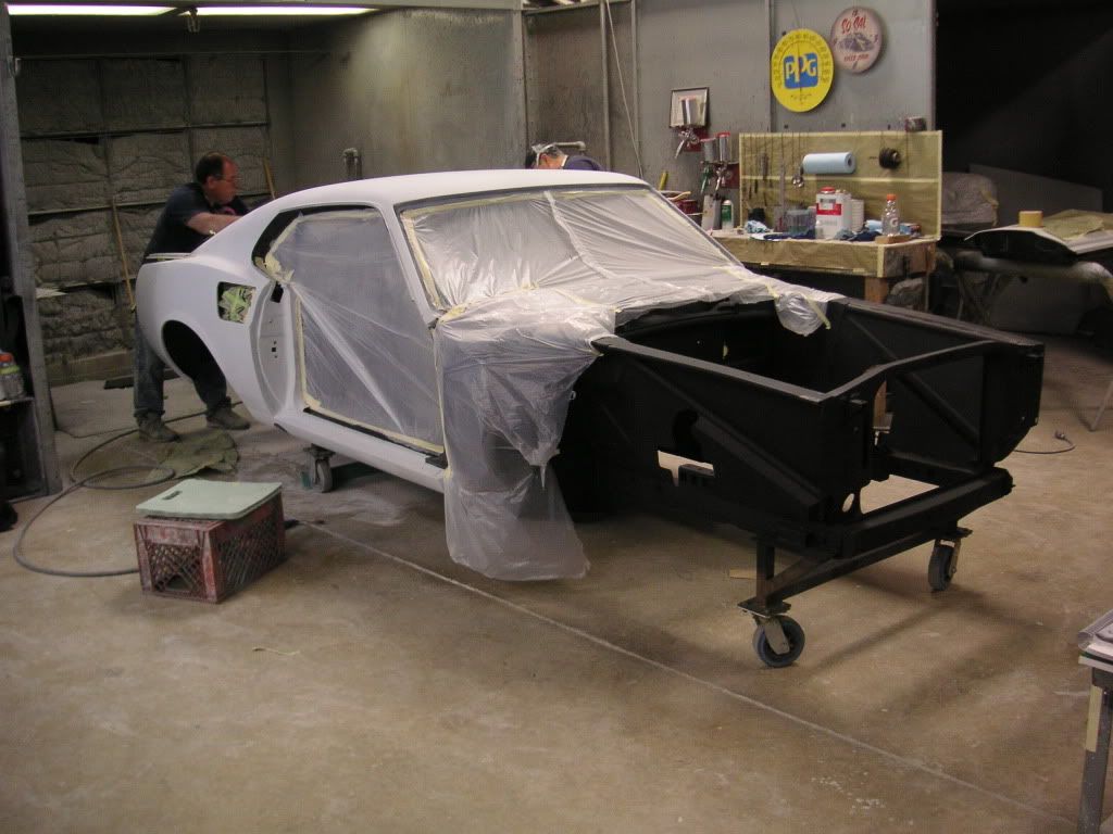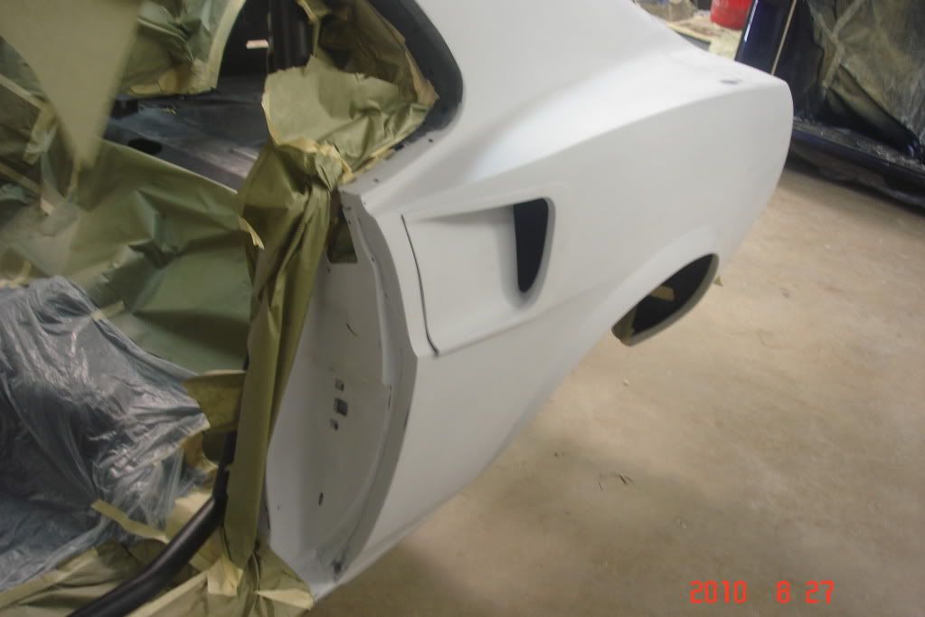Here are some update pics taken a couple days ago aver at Mick's Paint. The rear quarters were pulled out about 1 1/2" on either side. the wheel wells have also been mini-tubbed which will allow us to clear the monster 345 meats on the back. The quarters were a lot of work, but unless you knew it or had a stock Mustang next to it, you wouldn't know it. The front fenders that will be made in carbon fiber have also been widened to accomodate a wider tire and give us a little lip on the front wheels. If you were to look at the car from above, it would have a subtle hourglass shape.