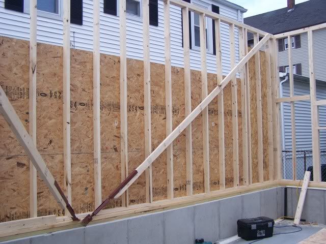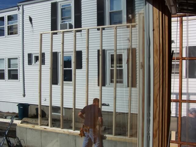 Well we had a good day today got three of the four walls up. The only one not up is one that ties into the house its only eight feet long. Here are some more pictures of the progress.