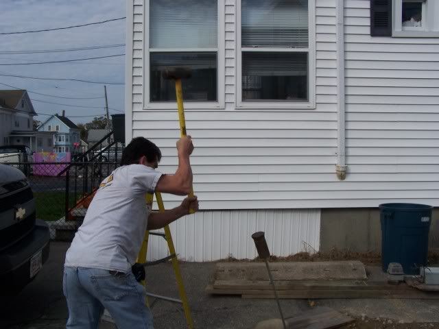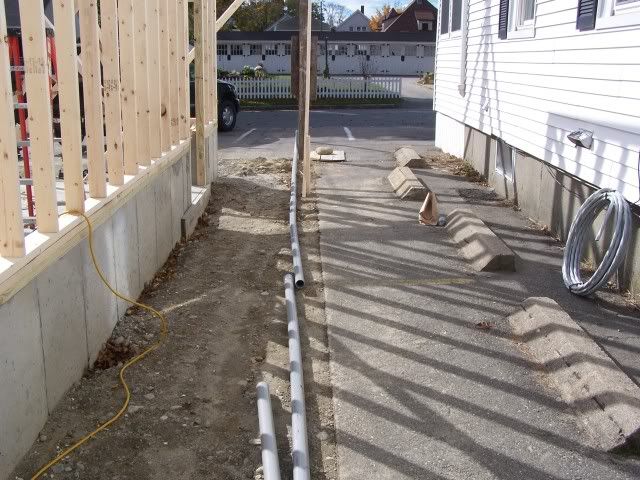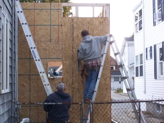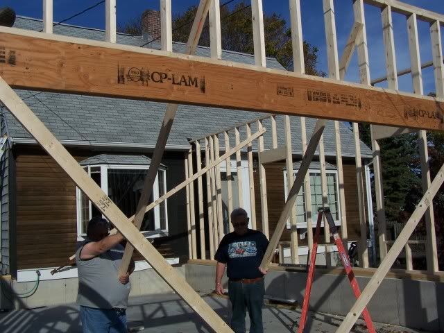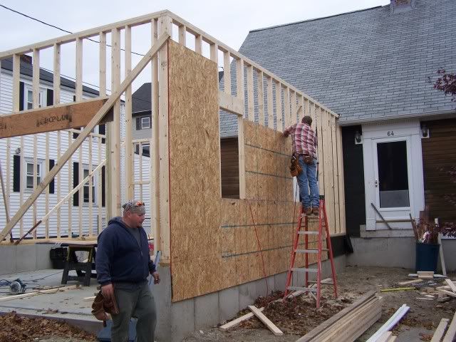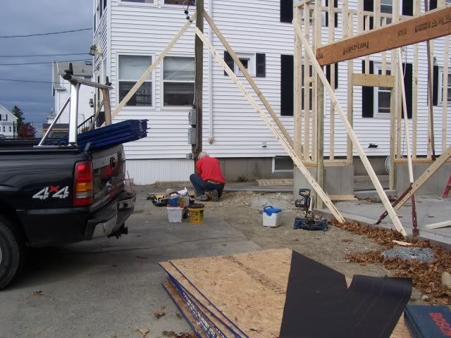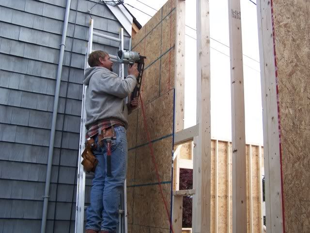 http://i172.photobucket.com/albums/w...goingup009.jpg http://i172.photobucket.com/albums/w...goingup010.jpg http://i172.photobucket.com/albums/w...goingup018.jpg http://i172.photobucket.com/albums/w...goingup015.jpg http://i172.photobucket.com/albums/w...goingup016.jpg And here's the guy who had the worst job of the day. http://i172.photobucket.com/albums/w...goingup008.jpg http://i172.photobucket.com/albums/w...goingup007.jpg I drilled a hole in a 2x4 to help him by holding t he ground rod from bouncing all over the place. But still glad I didn't have to do it. Tomorrow they will finnish the last wall and sheet it . We need an inspection from the electrical dept. Then he sends the ticket to the power company to inspect it . Then they put in for a demo permit from elec. co. Then they come to move the power wire to the temp service. I don't even want to think how long this deal is going to take. The top of the front wall is already touching the telephone wires and the power is only 3-4 feet higher. |