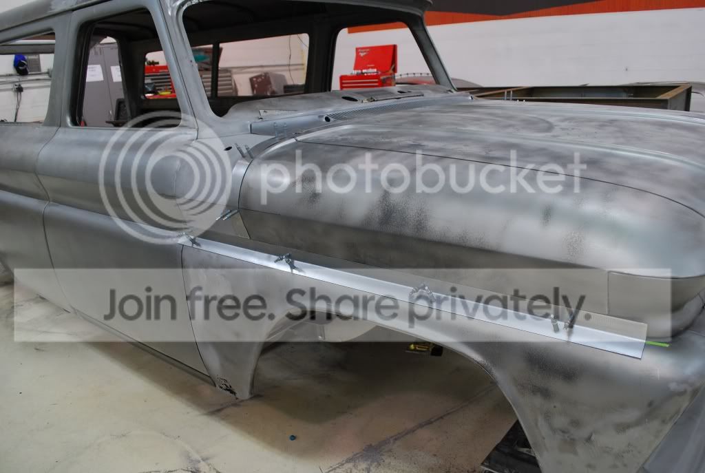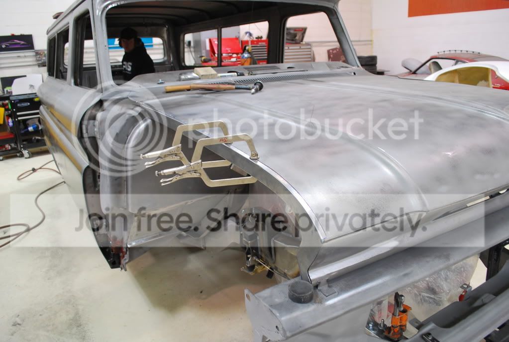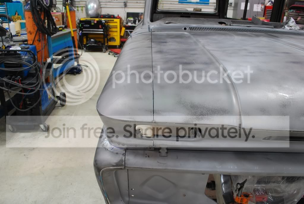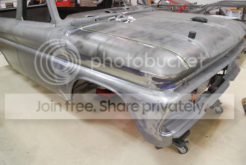 Started out by fabbing filler strips to eliminate the gaps and weld the fender to the hood as well as the cowl side to both the hood and fender. http://i563.photobucket.com/albums/s...ture222045.jpg http://i563.photobucket.com/albums/s...ture222048.jpg The hood and fender were then cut along the filler strip and the material between was removed. The filler strip was then tacked into place making the fender, and hood one piece. http://i563.photobucket.com/albums/s...ture222061.jpg The side portion of the hood was then cut away from the center so that it could form the top of the fender. http://i563.photobucket.com/albums/s...re222062-1.jpg Still have to finish the cowl to fender and cowl to hood filler on Monday. For now the filler strip is held in place. The goal is to make this look like the truck came from the factory this way. http://i563.photobucket.com/albums/s...ture222069.jpg |