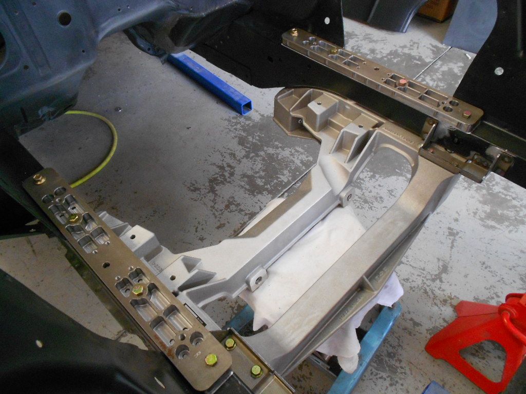 Front cradle bolted in place and new DSE front mounts welded in place of the stock sway bar mount