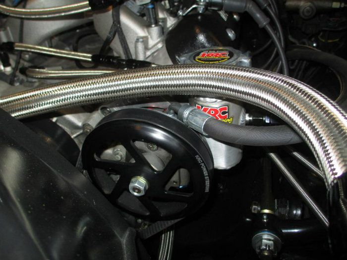 So far I have done one HPDE event with the KRC unit with no problems (no boil over). My educated guess is that the stock unit is not designed to run high RPM’s for extended periods. The speed of the pump is too fast and that creates extra heat. The KRC unit is better suited to running at higher RPM with the larger diameter pulley. This slows down the pump speed which helps to reduce power steering fluid temps. So far so good...no leaks the last time out. The power steering pump is mounted high on drivers side of engine. http://i1048.photobucket.com/albums/...psda8ef800.jpg http://i1048.photobucket.com/albums/...ps54c22e8c.jpg Here is a shot of the 6-1/2" diameter 6 rib KRC pulley. The mounting bracket was made by the engine builder. http://i1048.photobucket.com/albums/...ps62fdefeb.jpg |
