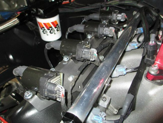 http://i1048.photobucket.com/albums/...ps87e99356.jpg http://i1048.photobucket.com/albums/...ps8d02fe79.jpg I used GM truck coils for this build. The truck coils have aluminum heat sinks to help dissipate heat.... a nice feature. http://i1048.photobucket.com/albums/...psa45d3093.jpg http://i1048.photobucket.com/albums/...psf628e60b.jpg I made a custom bracket to mount the GM truck coils to the Katech valve covers. The brackets are thin gauge steel and were cut out on a laser and then formed... I plan to make a new set from aluminum and then either polish or have them anodized red to dress it up a little under the hood. http://i1048.photobucket.com/albums/...ps44118bab.jpg |
