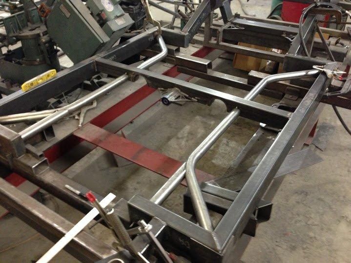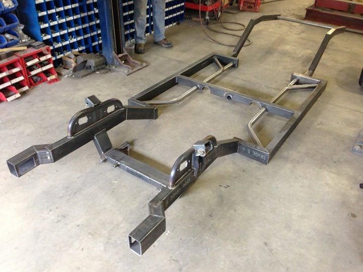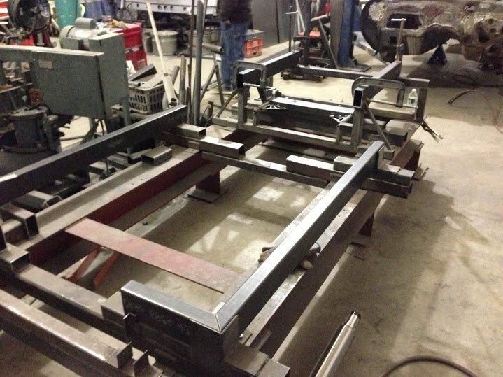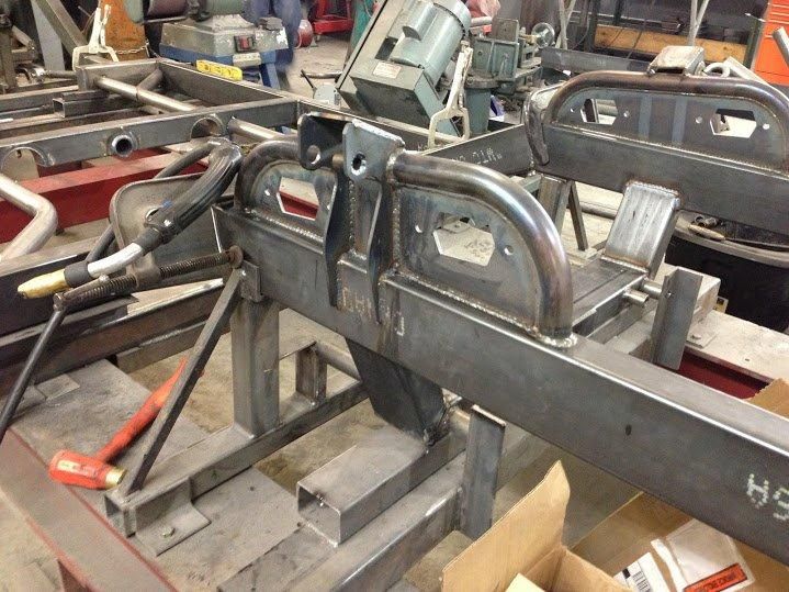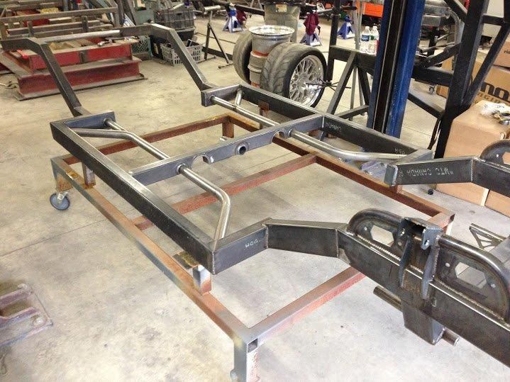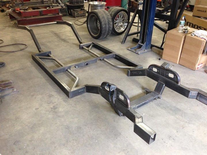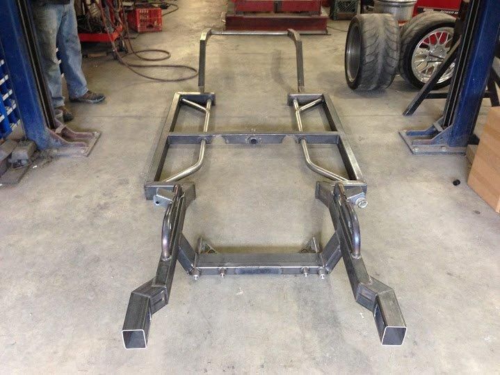 I can tell just by looking at the tubing its 2x4 tubing, looks like Jake snuck a piece of 3x4 in there where the core support bolts on,and 2x3 for the trans crossmember. Don't know for sure, but looks like 1 3/4" round tubing on the center there. I'm running the same front clip on the AMX I'm building.
