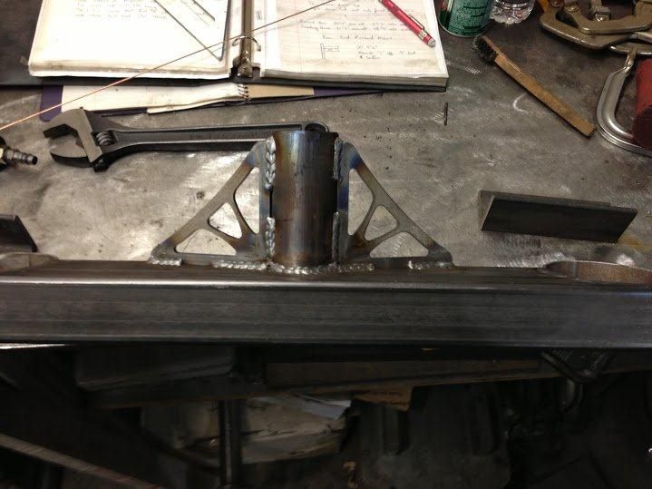 The 2x3 for the torque arm crossmember was done like that so when I run 3 inch exhaust it will not hang below the frame...Jake's idea