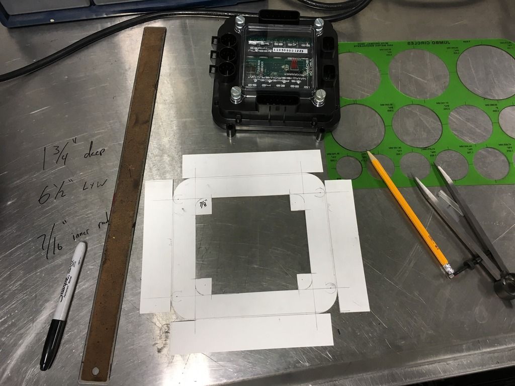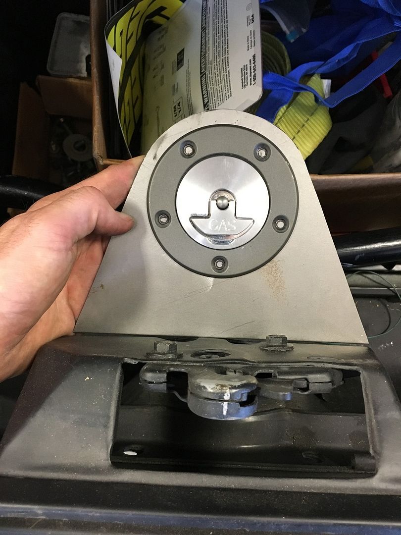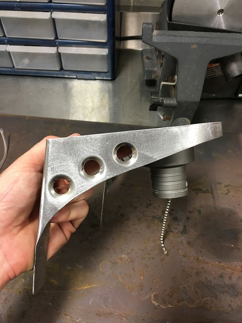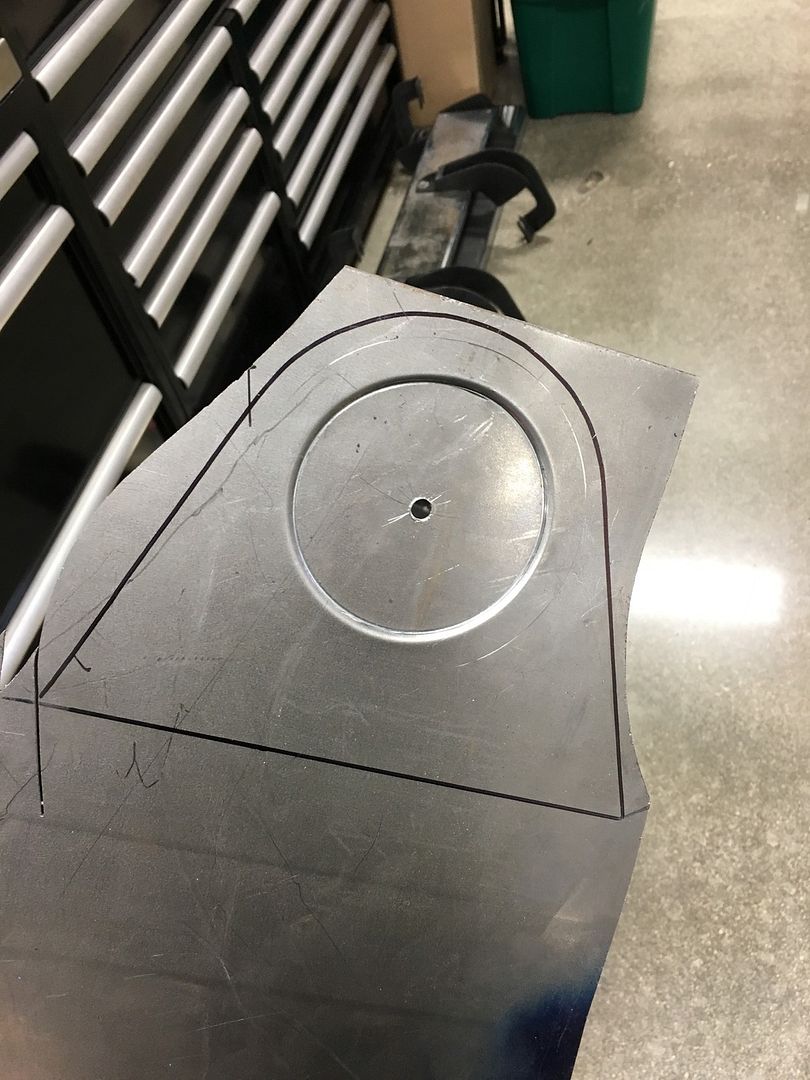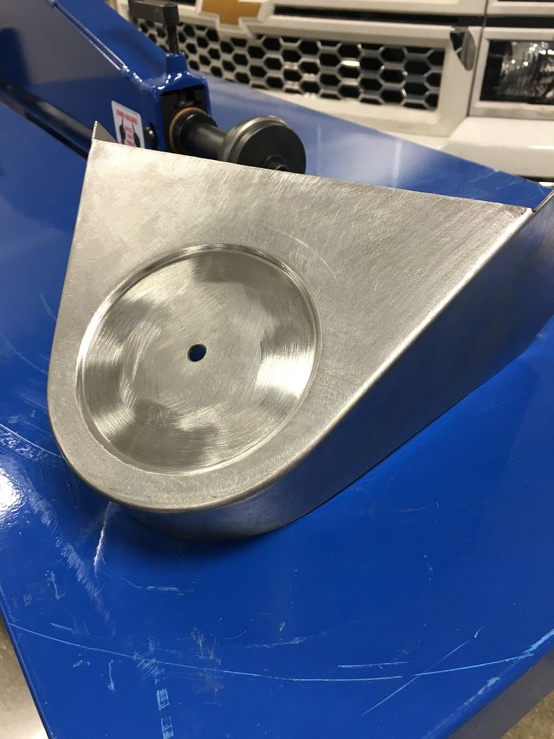 So I didn't like how my fuel filler came out. It's not bad, but it could be better. So I scrapped it and started over. The thing that bothered me to most was not being able to get a perfect circle recess. I thought about it last night and had an idea on how to make a perfect circle. After work tonight I cut some scrap 1/4" plate and made a pivot point. I'll refine it later for infinite adjustment for up to 14" circles with a slot and a carriage bolt.