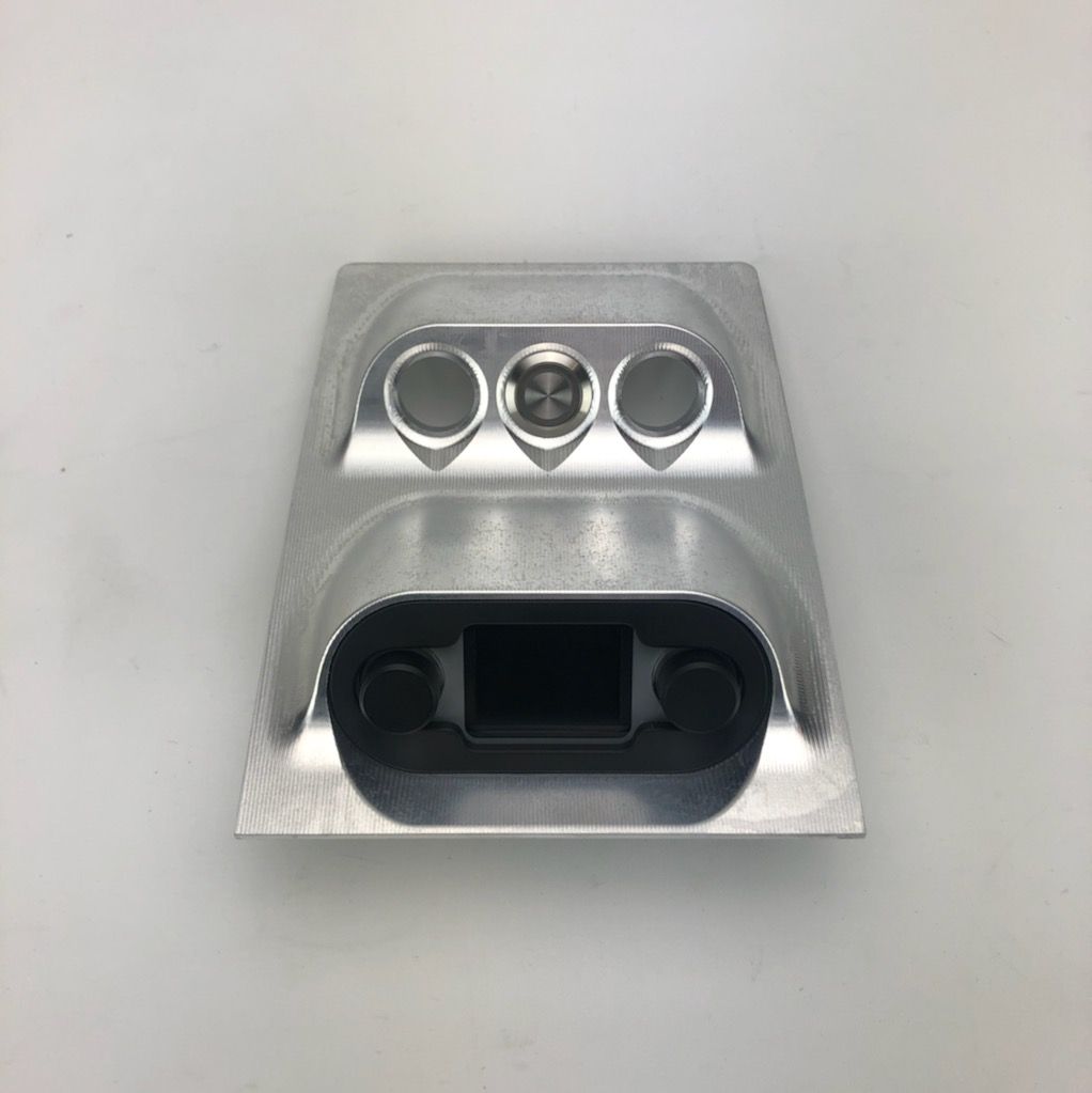 Keeping with the Pro-Classic theme, I wanted the center console to appear as stock as possible but with some modern amenities for comfort. One-off CNC parts by Jonathon at Sparc Industries allowes for housing the Vintage Air A/C controller and some 22mm billet buttons. Five billet toggle switches from Ring Brothers control the windows and power door locks and another CNC machined panel holds the cup holders and power outlets.