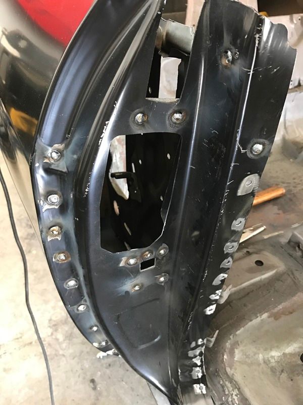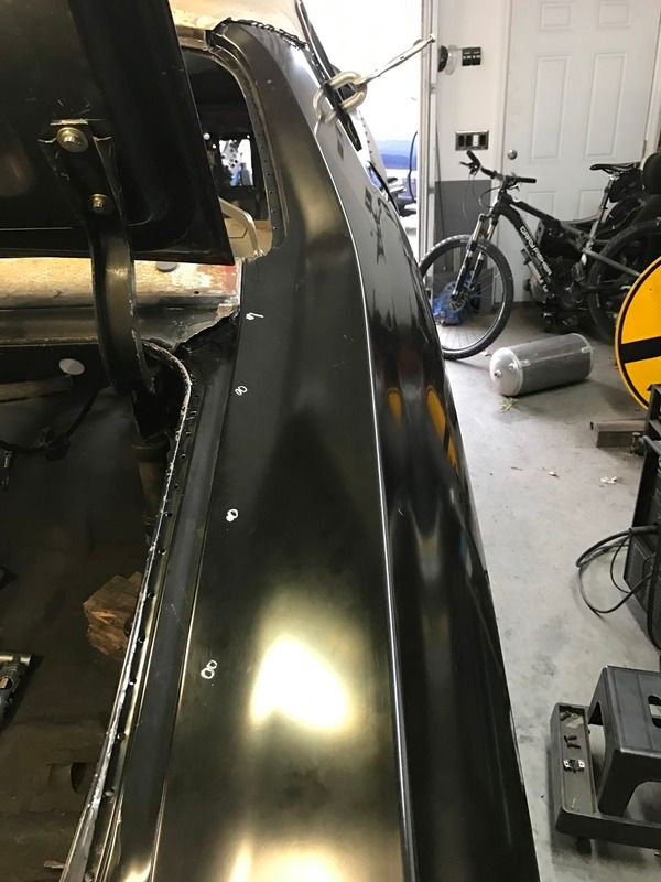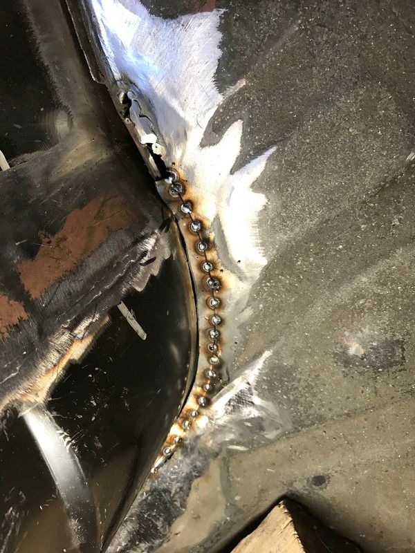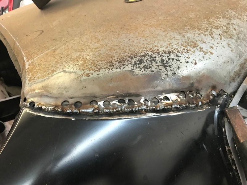 Well guys, so surgery went well, and I am on the mend. Still can't move my hand at the wrist full movement, but I can enough to get in the garage and do some work. The quarter panel is four spots from being officially welded in. I just need an extra hand on the last four. Here are pictures. Keep in mind, all these need to be buffed down.