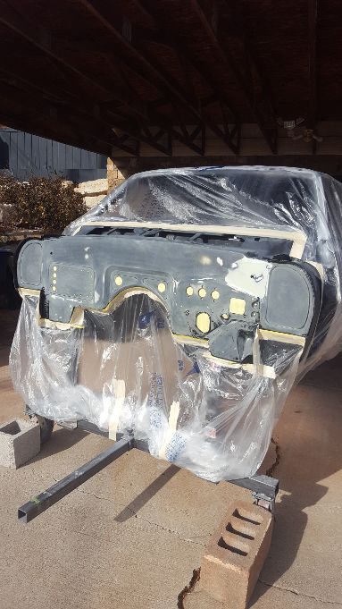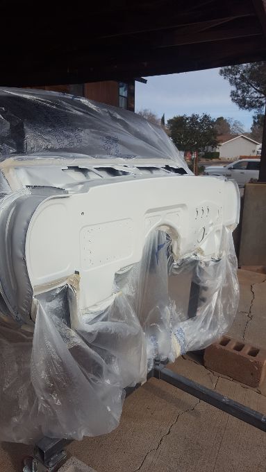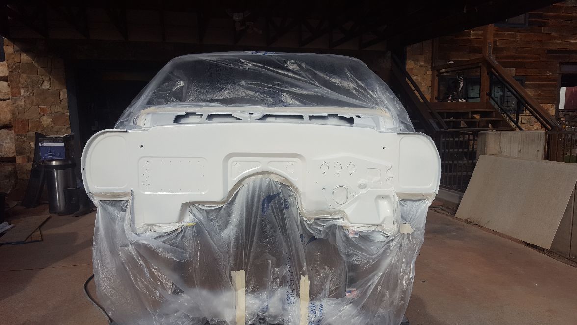 Just a quick update. We have finally been able to get some more prep work done. The next stage of blocking was done on the firewall and it has been sprayed with three coats of white CRE. I have reserved a paint booth for the first week of February. The body and all remaining parts will be sprayed with CRE in the booth, and the firewall will be painted the final white. We will bring the car back home and complete final blocking before paint. We will also install the subframe and drivetrain for the final time and turn it into a roller ready for paint and final assembly.