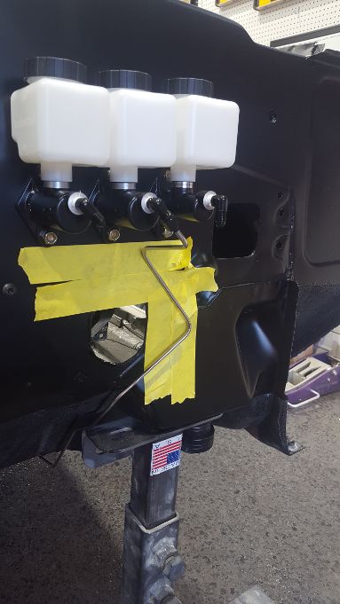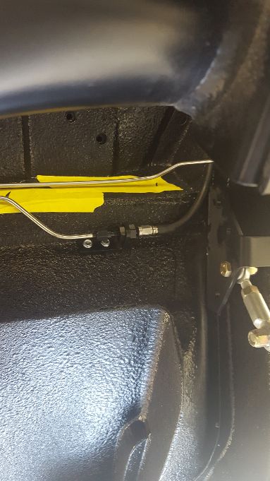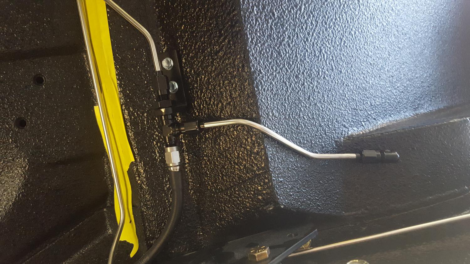 I have a paint booth lined up, but my wait is somewhere between two and six months. In the meantime we will be finishing as much as we can, starting with the brake and hydraulic lines. Also drilled the holes to run the JRI remote reservoirs in the trunk.