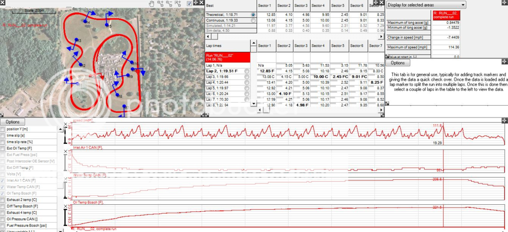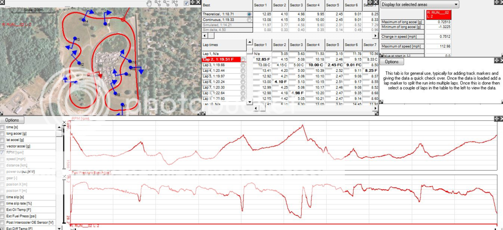 The cooling system worked great. The ambient air temp was 87 F. On a 15 minute session the oil temp stabilized at 207 F and the oil temp was 231 F. http://i439.photobucket.com/albums/q...psikmgi5mp.png Now the bad news the fuel pressure is still falling off with high load. http://i439.photobucket.com/albums/q...psqaj3kuxz.png All this data is off my built in Race Technologies dash. It is nice to look at data after the test and have to relay on looking at the dash. |