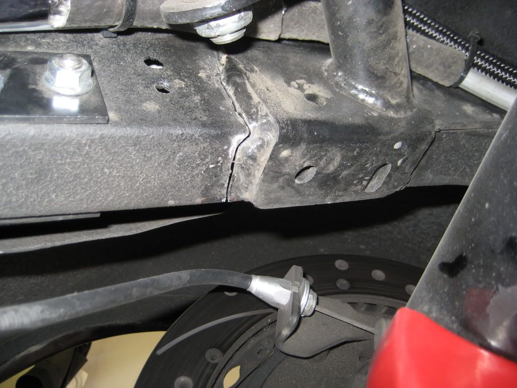 I would clean the frame rail to bare metal passed the OEM Galz.coating.Use a small grinder and bevel the crack to the inside of the frame rail.I would use a tig welder to control the heat in the weld zone.Then metal finish the weld smooth.Trying not to remove any of the frame rail material.Fab a small diamond shaped gusset(3in.tall x4.5 long) for the outside of the frame.Then I fab surport gusset the shape of the frame from the lower bracket to upper on both sides of the the frame.This should spread out the load from the upper link's thur the side of the iner frame back to the shock cross tube.Todd good luck.If you were closer I could help you out.:thumbsup: Scott M.