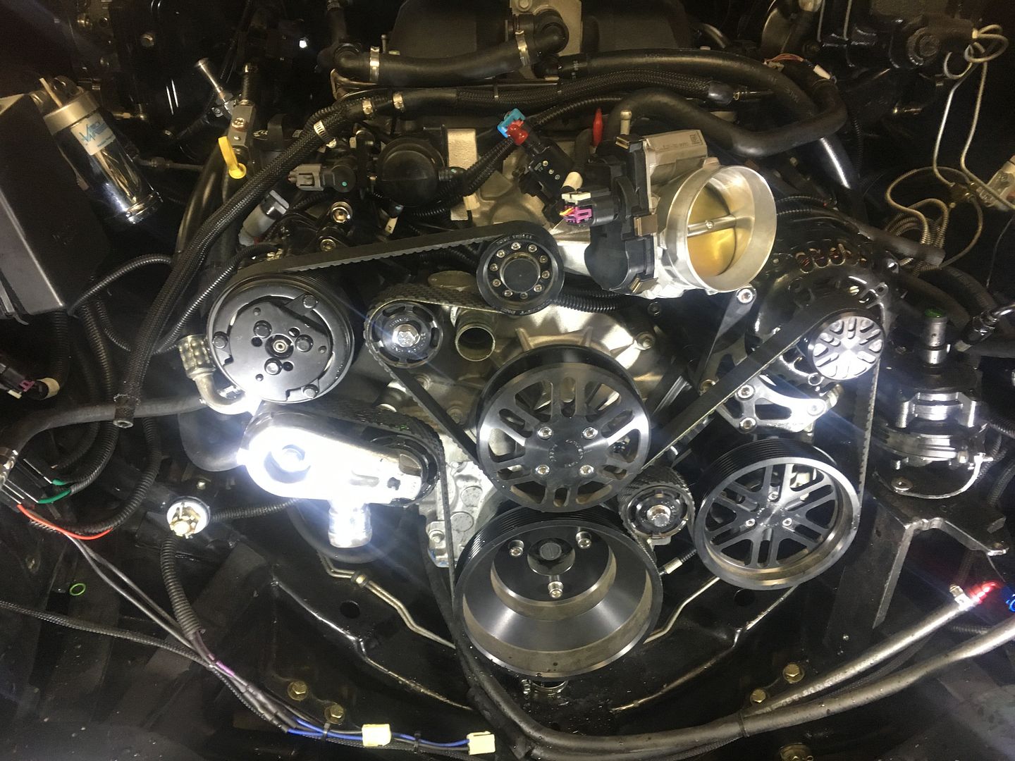 I bought a Concept1 front drive system while putting the car together. After final assy it turned out that the single belt front drive setup was designed to run everything off the forward positioning of the Super Charger drive pulley. This had all the pulleys and tensioners in that forward position. After the Radiator and fans were installed, everything fit but just barely..... If something would have happened on the road there would have been some major issues having access to the components on the front of the engine..... An uncomfortable position I didn't want to put myself in..... So...
