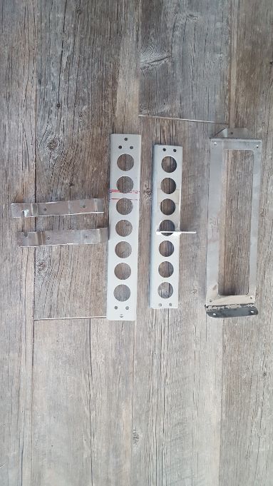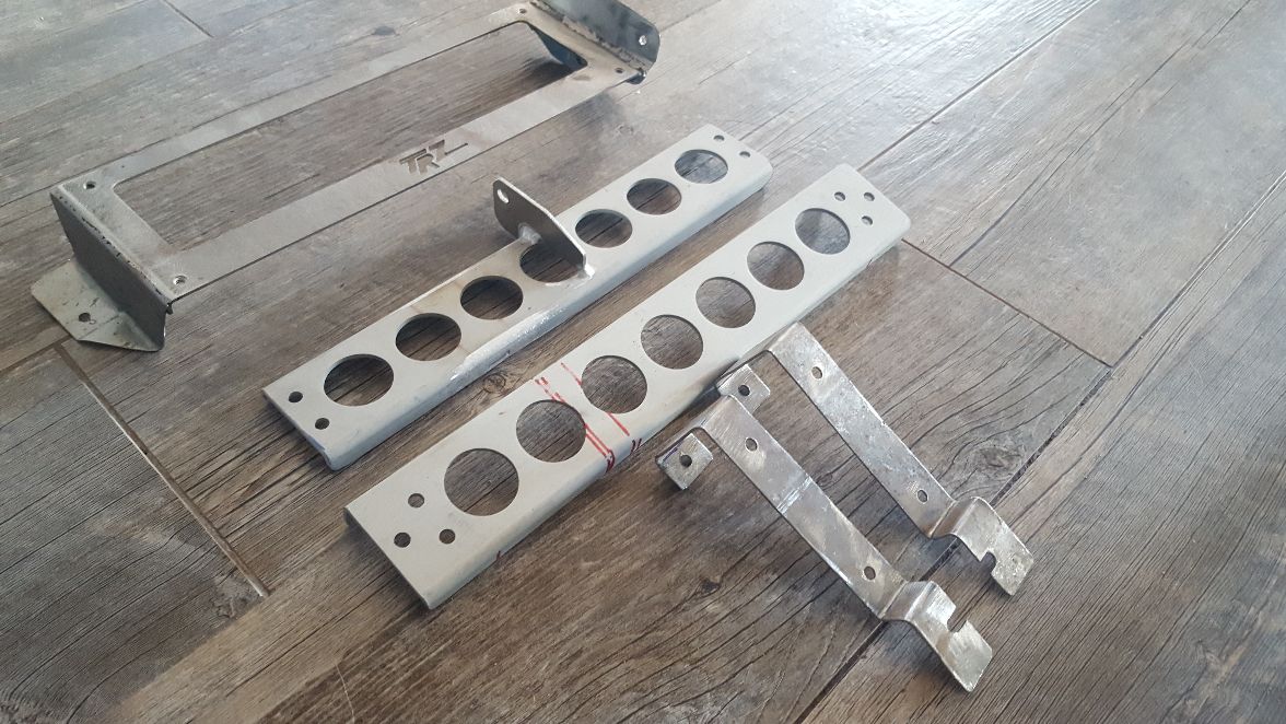 Just sent these pieces off to the powder coater. Some brackets we fabbed up and modified. The single one holds the Holley Dominator above the A/C unite under the dash. The two larger brackets have been modified to hold the oil cooler in front of the condenser and the two smaller brackets hold the remote power steering cooler in center opening of the lower valance.