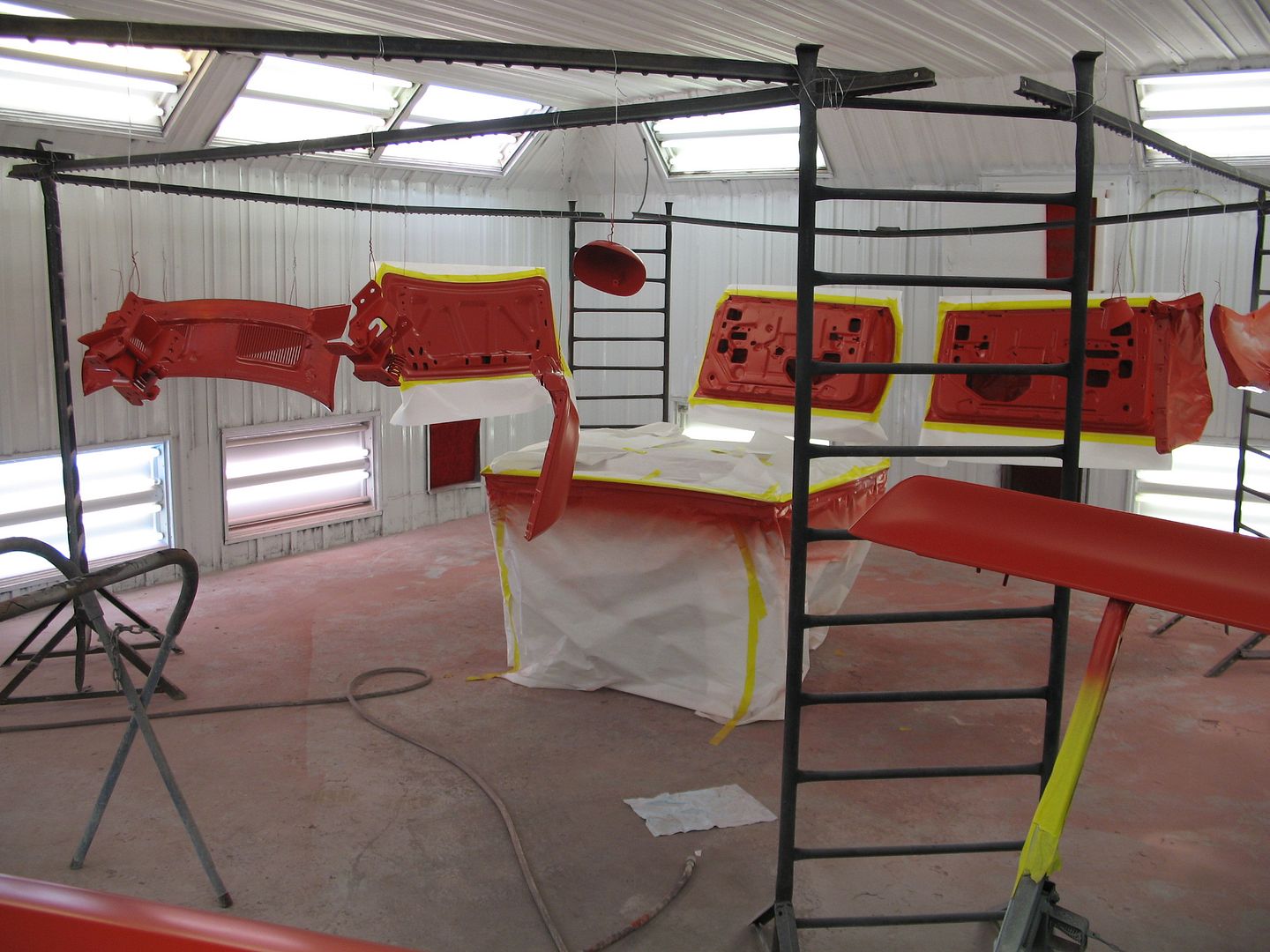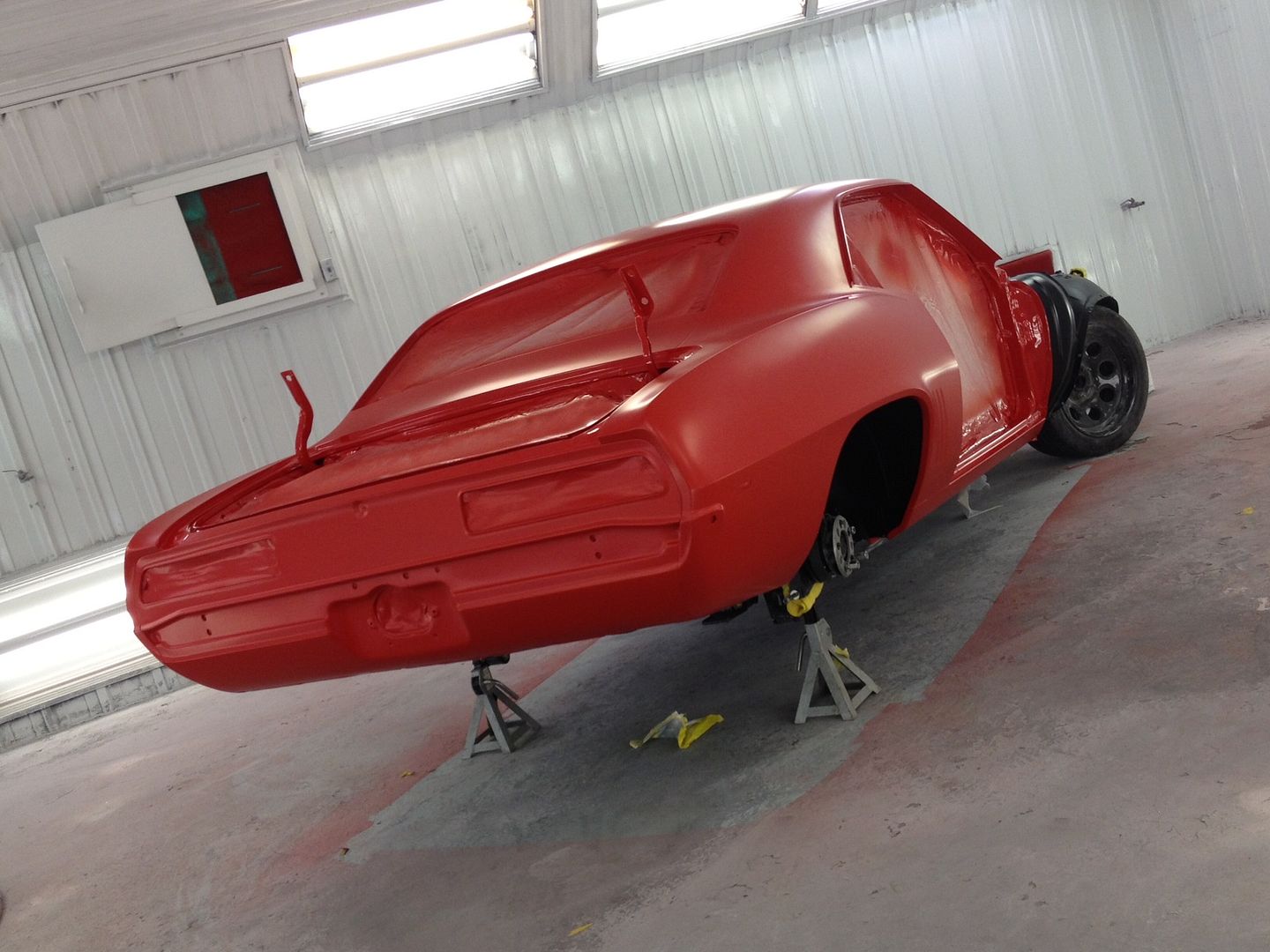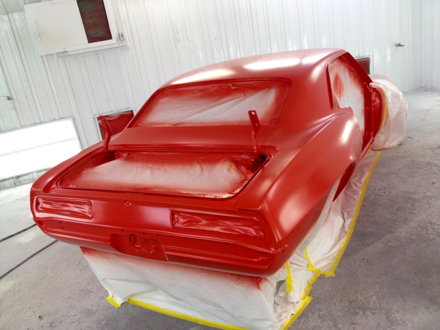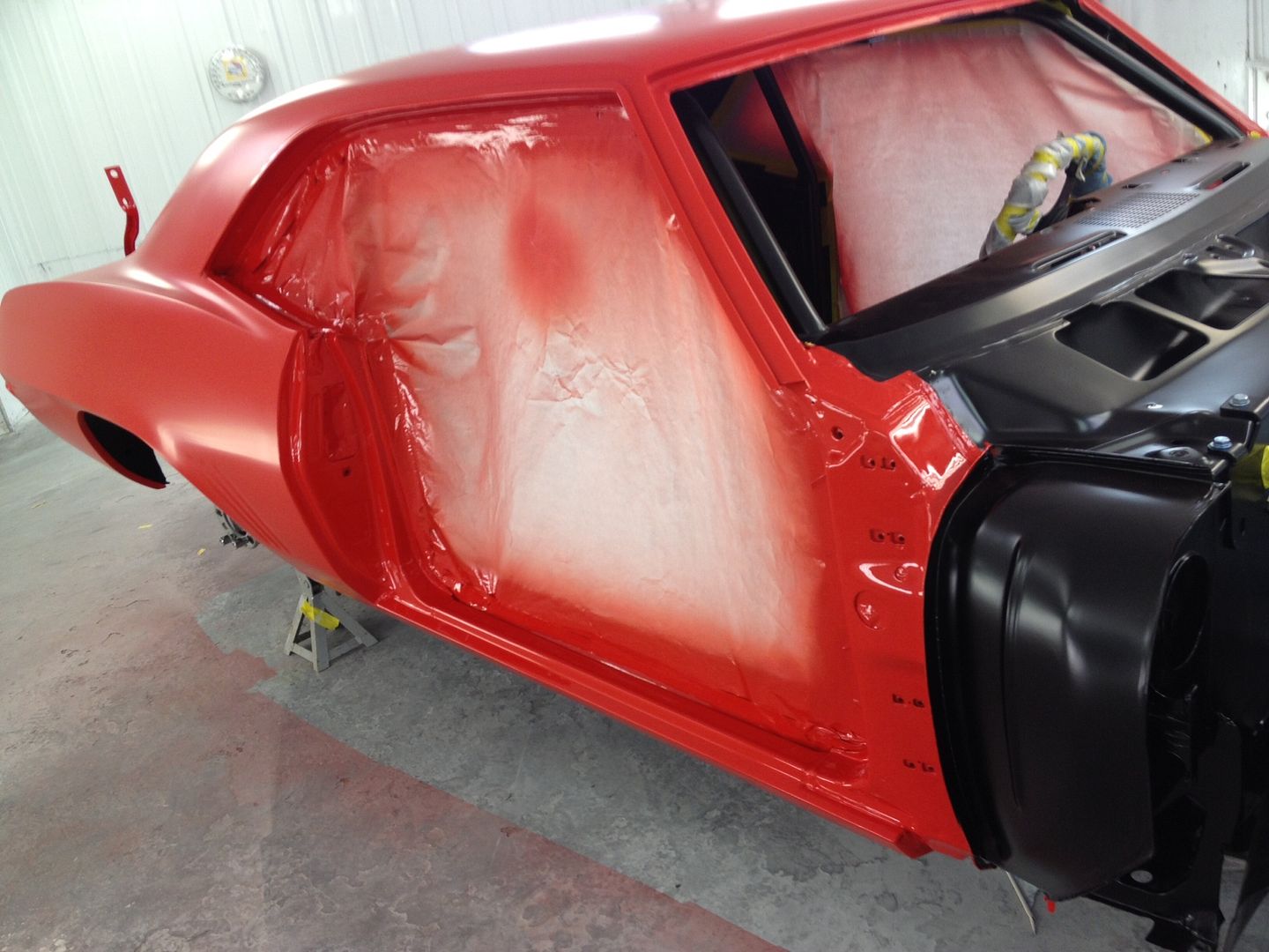 After some thorough cleaning and careful masking..... http://i1140.photobucket.com/albums/...psd1872086.jpg We finally have COLOR!!! http://i1140.photobucket.com/albums/...ps10b3b502.jpg http://i1140.photobucket.com/albums/...psd72c3dc5.jpg The jambs have been cleared. It's amazing how much the color changes and pops when the clear is applied. The color is called Mars Red. It is right in between red and orange. It's actually the same color it was before we started the project because we always liked it so much and we never saw another one in that exact color. I'm glad we didn't have to wonder what a new color would look like. That would have been a very difficult decision to make. http://i1140.photobucket.com/albums/...psbfe4e824.jpg http://i1140.photobucket.com/albums/...pscdb98741.jpg The rest of the parts were also sprayed and Nathan is preparing them for clear coat in the jambs, under the decklid, etc. http://i1140.photobucket.com/albums/...psb54de913.jpg http://i1140.photobucket.com/albums/...ps901e096b.jpg While Nathan is painting the other body parts some of the reassembly was begun. http://i1140.photobucket.com/albums/...ps2ccb9a9c.jpg http://i1140.photobucket.com/albums/...ps8818bbcb.jpg When the other body parts are ready, they will be installed and then the whole car will be masked and sprayed again with base coat on the outside to assure perfectly even color. Then it will be cleared, stripes added and then the final clear coat will be sprayed. A lot of steps remain but it sure is exciting seeing it in color again!!! |