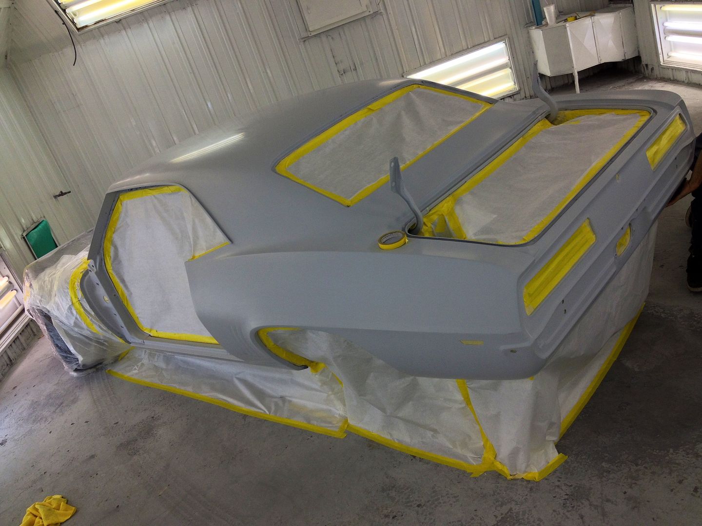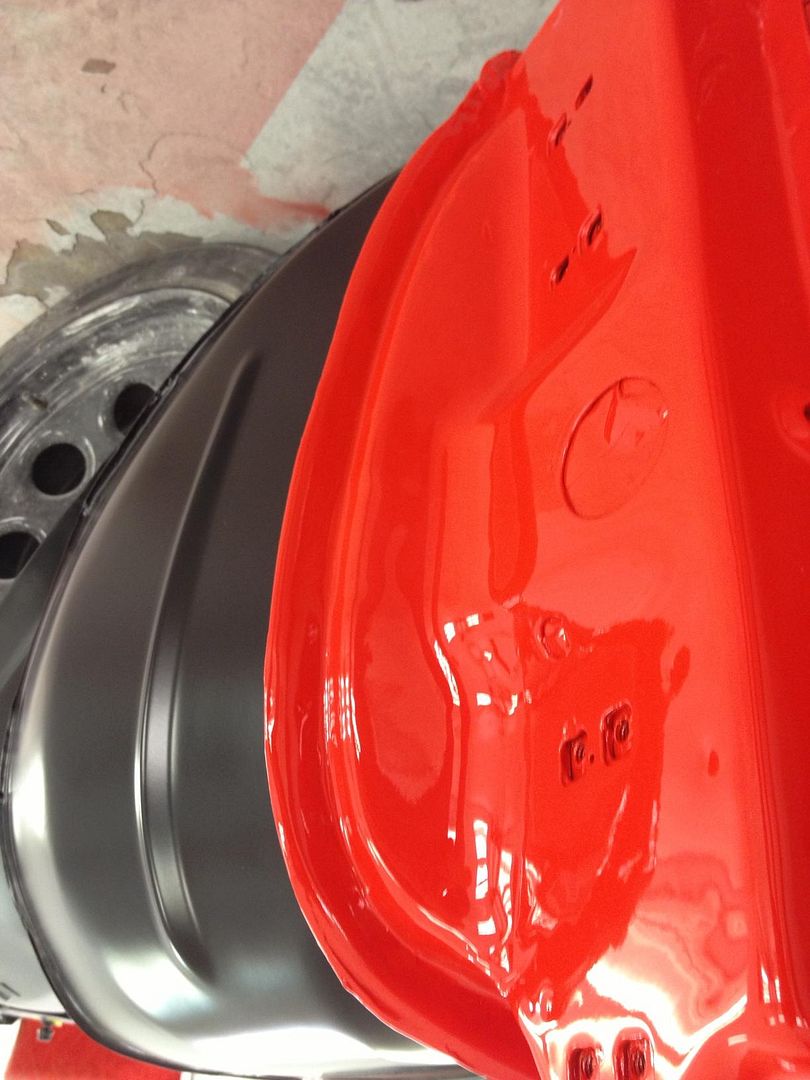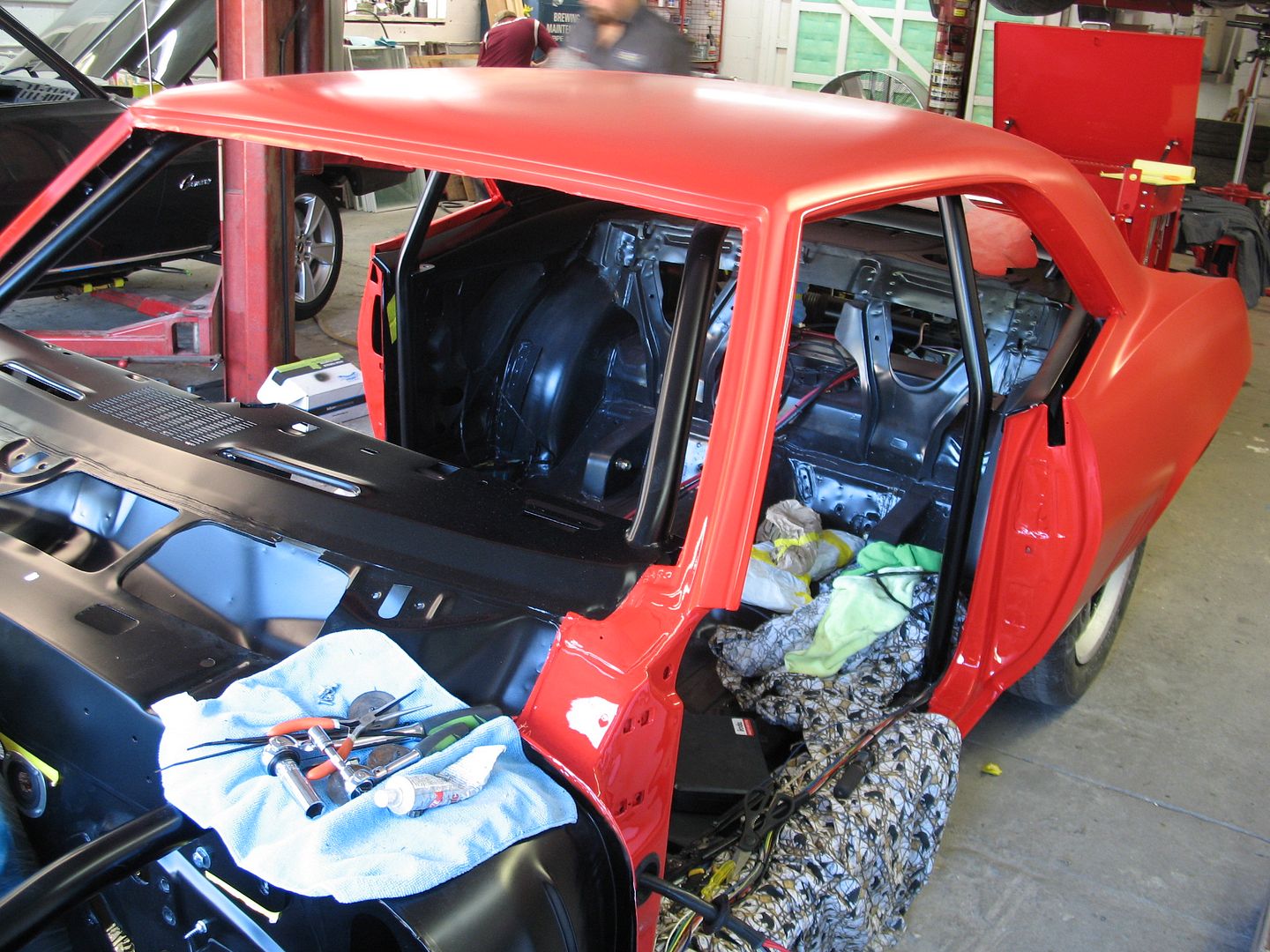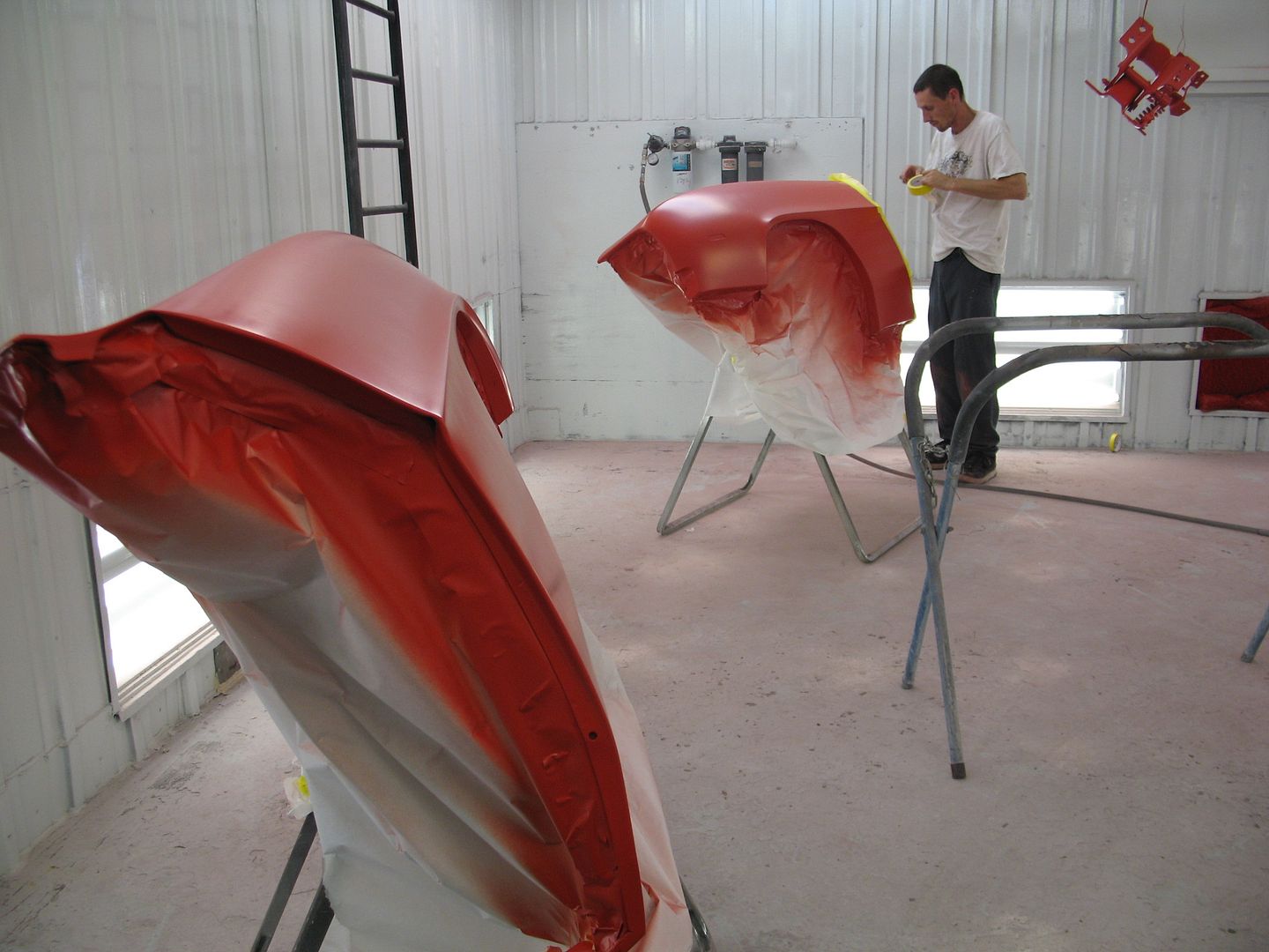 After some thorough cleaning and careful masking..... http://i1140.photobucket.com/albums/...psd1872086.jpg We finally have COLOR!!! http://i1140.photobucket.com/albums/...ps10b3b502.jpg http://i1140.photobucket.com/albums/...psd72c3dc5.jpg The jambs have been cleared. It's amazing how much the color changes and pops when the clear is applied. The color is called Mars Red. It is right in between red and orange. It's actually the same color it was before we started the project because we always liked it so much and we never saw another one in that exact color. I'm glad we didn't have to wonder what a new color would look like. That would have been a very difficult decision to make. http://i1140.photobucket.com/albums/...psbfe4e824.jpg http://i1140.photobucket.com/albums/...pscdb98741.jpg The rest of the parts were also sprayed and Nathan is preparing them for clear coat in the jambs, under the decklid, etc. http://i1140.photobucket.com/albums/...psb54de913.jpg http://i1140.photobucket.com/albums/...ps901e096b.jpg While Nathan is painting the other body parts some of the reassembly was begun. http://i1140.photobucket.com/albums/...ps2ccb9a9c.jpg http://i1140.photobucket.com/albums/...ps8818bbcb.jpg When the other body parts are ready, they will be installed and then the whole car will be masked and sprayed again with base coat on the outside to assure perfectly even color. Then it will be cleared, stripes added and then the final clear coat will be sprayed. A lot of steps remain but it sure is exciting seeing it in color again!!! |