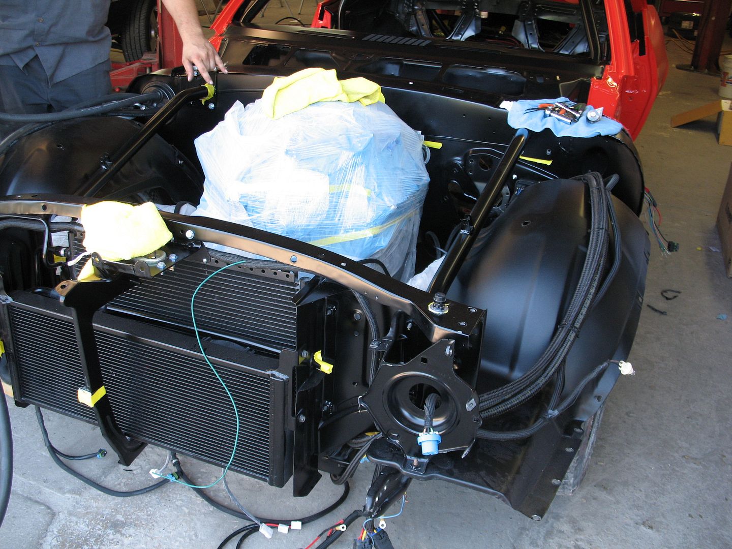 We are very excited about how the car is turning out! The Mars Red slips right between Hugger Orange and bright red, and it works extremely well with the black accents on the car. We should have the sheet metal back on the car today, and then it goes back in the booth for stripes and more clear.