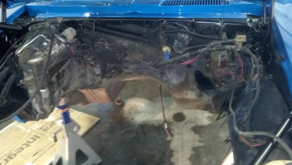 http://i1072.photobucket.com/albums/...ps8a3ca138.jpg http://i1072.photobucket.com/albums/...psb63a9393.jpg The car has to go up pretty high to get it out but it is a whole lot better that doing it all from the top after it is painted. few wires and tranny lines and hoses and it comes down pretty easy. http://i1072.photobucket.com/albums/...ps78c97dd1.jpg now clean up the firewall and AC box along with the wiring. |