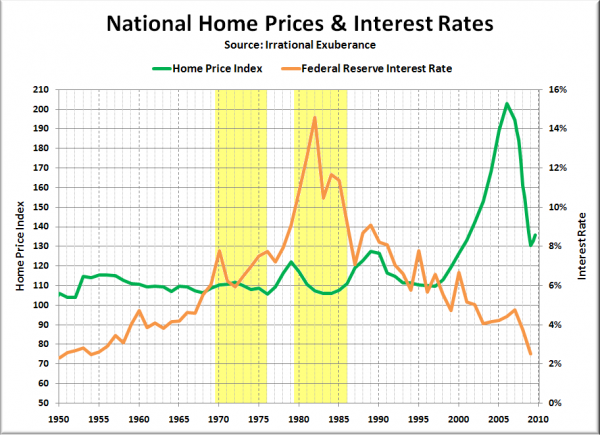 There's no question that they are linked..... but what the reality is is that prices don't go UP --- and buyers are forced to buy down to what they can afford on a monthly basis as rates rise... so while the two are related - the rise in rates doesn't mean that suddenly houses are going to go down 25%. It just doesn't happen. What you really see is that houses go UP quickly (too fast) as the rates are low. What I was trying to show with my rate example is that while you might get a house a smidgen lower -- you'll more than make up for your "deal" in interest. The perfect storm to buy has been the last two or three years --- falling house prices with the lowest rates in 50 years. Not likely to repeat that scenario --- as houses are already getting multi bids - prices inching up -- and it's almost a given that rates will climb from these historic lows. |