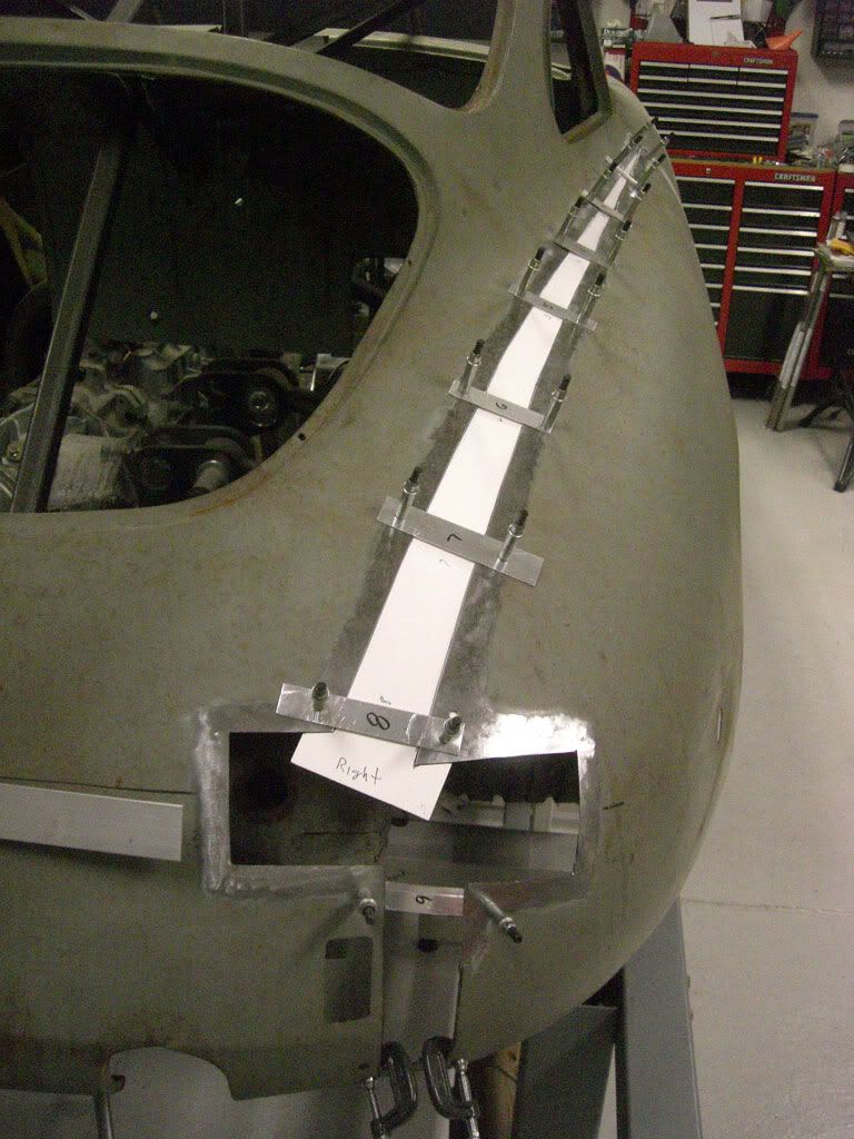 Prepped the weld areas. http://i940.photobucket.com/albums/a...der-Mod-13.jpg Put some template paper under the openings and transferred. http://i940.photobucket.com/albums/a...-Mod-2_00a.jpg Cut them out and drop them back in from the top to verify. http://i940.photobucket.com/albums/a...-Mod-2_00b.jpg Attach the templates to 20 gage steel with spray photo mount and cut out. http://i940.photobucket.com/albums/a...-Mod-2_00c.jpg Drop the steel pieces back into the openings and do final fit check and trimming to get them as close as possible for a TIG fusion weld. http://i940.photobucket.com/albums/a...r-Mod-2_01.jpg Tack them in and fill the cleco holes with the MIG. http://i940.photobucket.com/albums/a...r-Mod-2_02.jpg http://i940.photobucket.com/albums/a...r-Mod-2_03.jpg And finally got to use the new welding table ! http://i940.photobucket.com/albums/a...r-Mod-2_00.jpg Ready for the bottom pieces and fill the tail light openings. Jim |