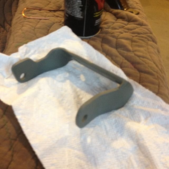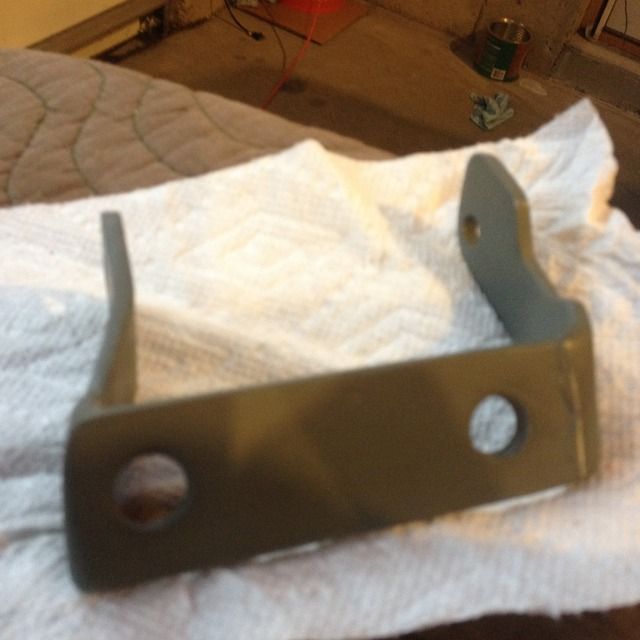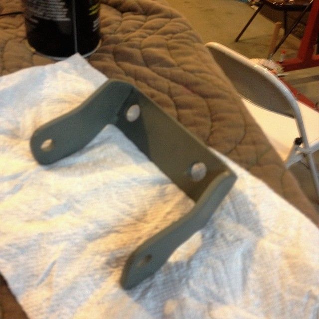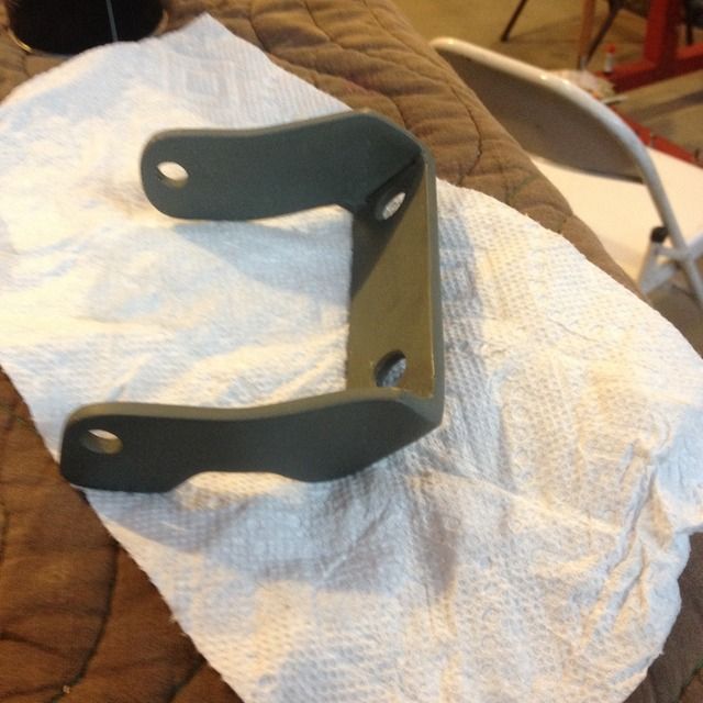 Got a little done today, we started to make a top bracket to hold the A/C compressor in the low mount position. We had it together and then the A/C connections for the compressor came in and of course it was going to be tight on one side so apart it came. I bent up another arm and Spacemwn welded it on. I cleanded it up and primed it today and I'll paint it tomorrow.