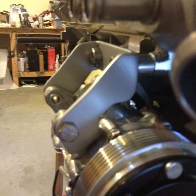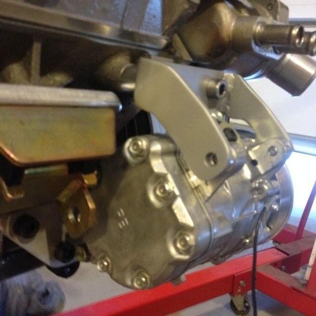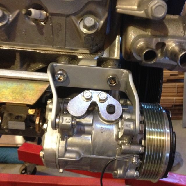 Last night I painted the A/C bracket and today I installed it to see how it looked. Lesson learned, bring you glasses when you need to read a paint can. I picked up two cans of paint. One aluminum and the other metalic satin Nickle. Ah I'll get the aluminum so it will blend in instead of black. Get home spray the bracket, hmm looks pretty good. 3 coats, read the can Nickle ??? But it looks good so maybe somebody was watching over me and helped with the color choice.