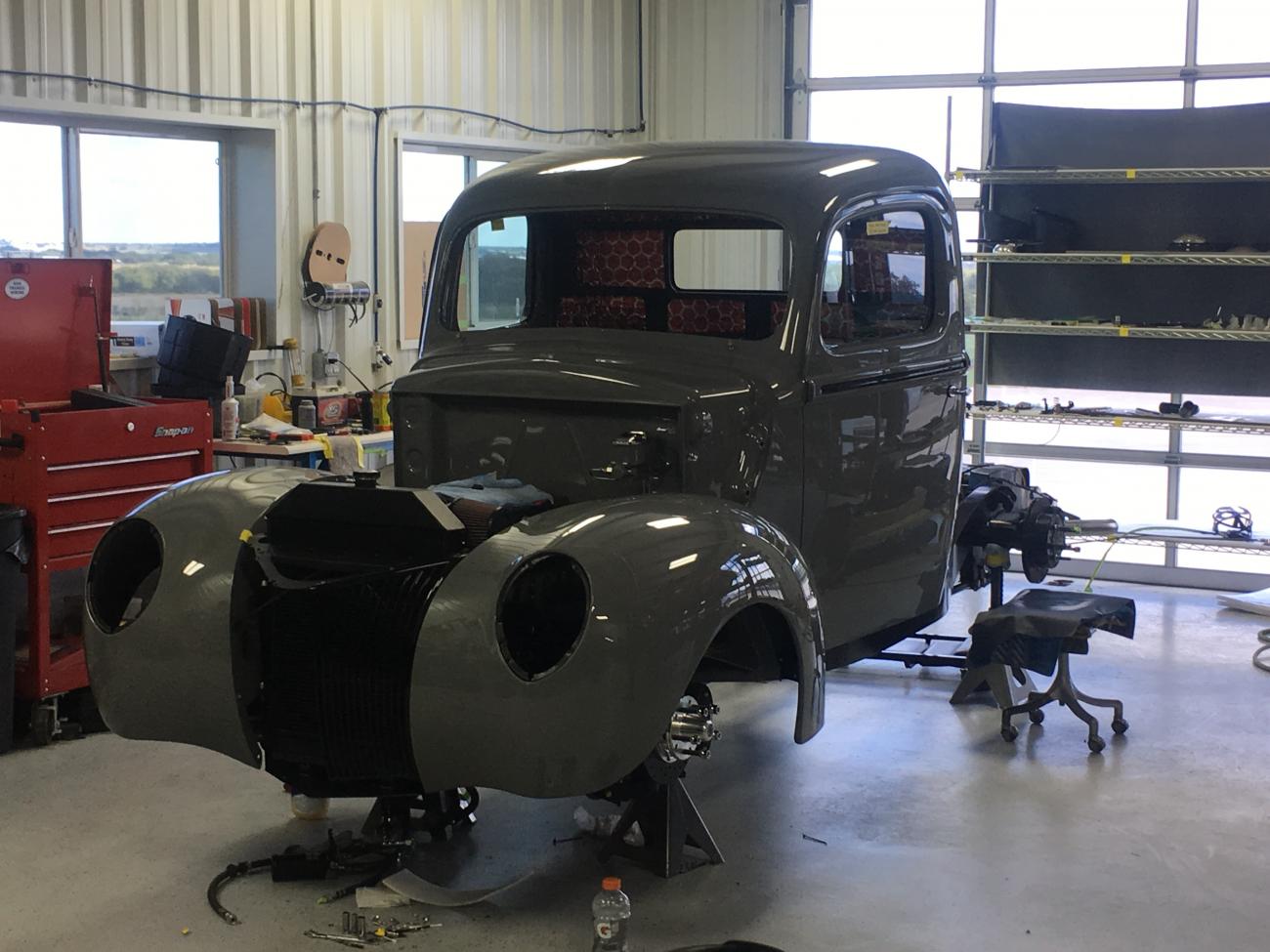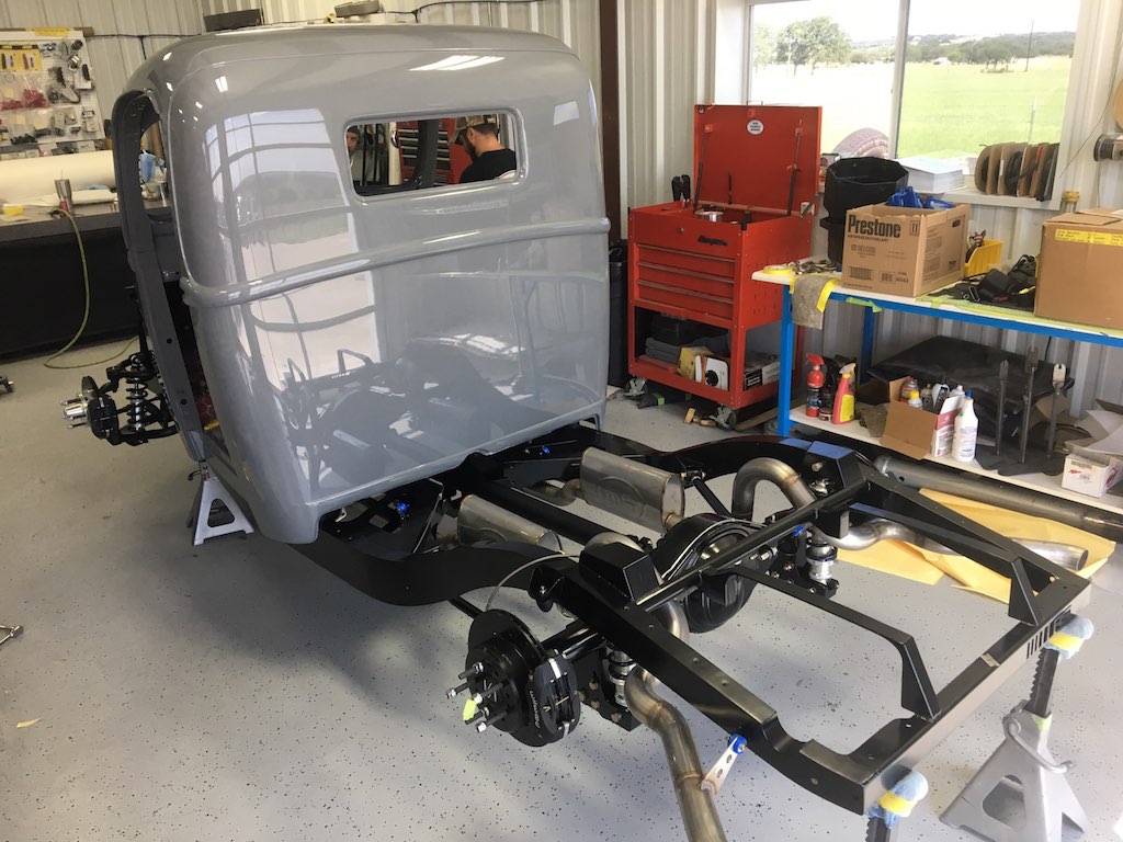 Truck looks great Greg, I like the all black chassis and components. Radiator exhaust.. The average person is going to have to really look twice to realize this is a modern vehicle and not a restored 40 Ford pickup. I saw a while back your comment on the grey color and knew what. You where thinking. I was a painter at Toyota dealership and notice the colors and how they change from years past. I just had this conversation with a friend the other day about colors cycling.. That similar grey was probably a color back in 30's then in the 60s and now again..anyhow looks great! Progress ya gotta love it!