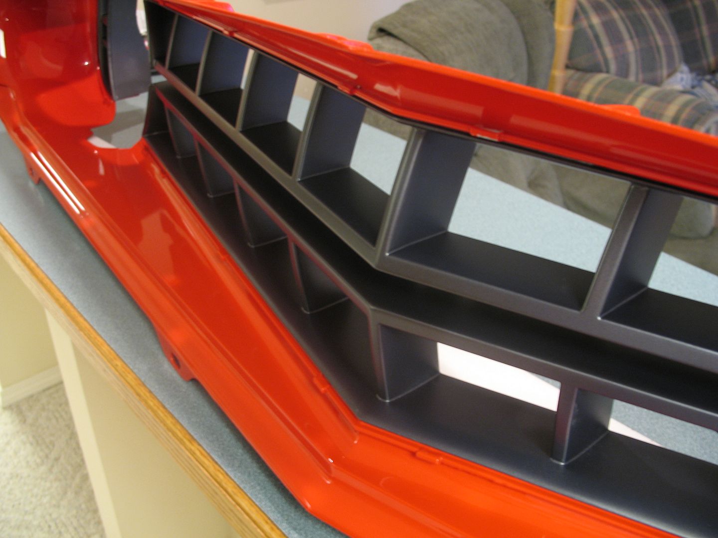 We did not fasten it down so it is sitting up on the soft foam seal around the perimeter so it is a tad high in these pics. I think the V8TV crew nailed it. It looks exactly like Dan's rendering. http://i1140.photobucket.com/albums/...psc3af681f.jpg http://i1140.photobucket.com/albums/...ps6fed4e26.jpg http://i1140.photobucket.com/albums/...psf11e57c1.jpg http://i1140.photobucket.com/albums/...ps2780baa9.jpg The grille is also coming along nicely. Jeremy spent the better part of his weekend making the paint finish on the grille perfect. He is very conscientious. He told me he couldn't sleep well until he got it just right. http://i1140.photobucket.com/albums/...psddeffb04.jpg http://i1140.photobucket.com/albums/...ps7483d4bf.jpg http://i1140.photobucket.com/albums/...psbf153b1f.jpg http://i1140.photobucket.com/albums/...psf36d9421.jpg http://i1140.photobucket.com/albums/...ps18238ed8.jpg http://i1140.photobucket.com/albums/...ps36cb574e.jpg |