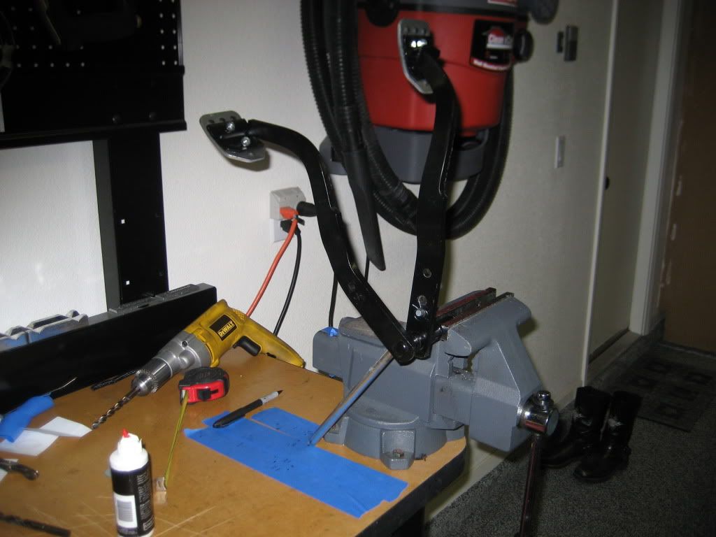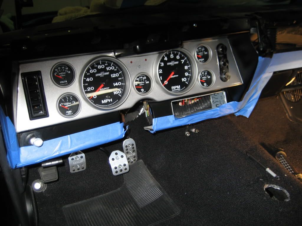 I spent most of the afternoon in the garage. My engine dyno is tenantively scheduled for next Monday so I'm trying to get a head start.:D I insulated the firewall and cowl with second skin dyna pro. I've got the AC/Heat all mocked up and all the routing and fittings figured out. I'll have the unit back under the dash next week and get the wiring buttoned up. I'm going to wait until the engine is in to plumb everything else. I did get the condensor brackets painted and installed. It disappears nicely. I wired in another LED in series with the current high beam LED. It was just to bright at night. This will cut the voltage in half and it should be about right. I just shrink wrapped it so it won't emit light. I also cut the hole for the oil temp gauge between the speedo and tach. That wasn't fun, one mistake and it needed repainted. Turned out nice. I also played with pedeal ratios. I drilled a hole 5/8 higher which takes it from a current 8:1 ratio to a 12.4:1. Basically cutting pedal pressure needed by a 1/3rd. The side effect is less piston travel per stroke. After mocking it up and measuring, I decided to stay with the current setup. If I decide to go to a 1" bore master later, this hole would give me the same pedal feel with more volume. The dash insert is back in and I'll get the radio and steering column back in the insert tomorrow.