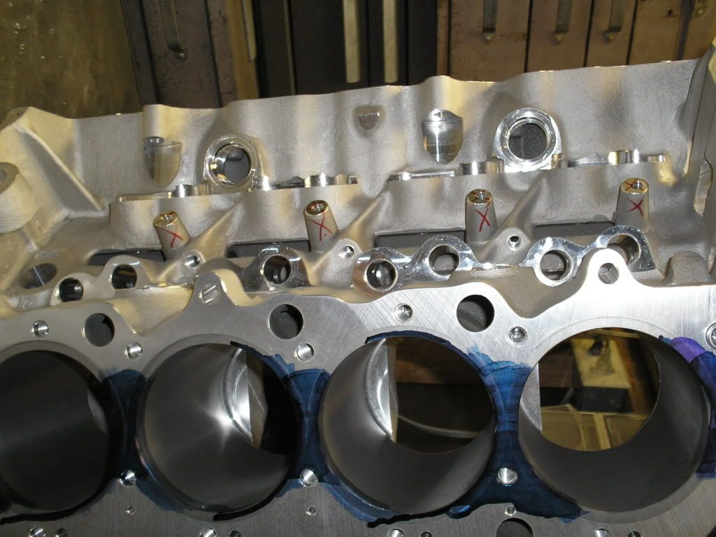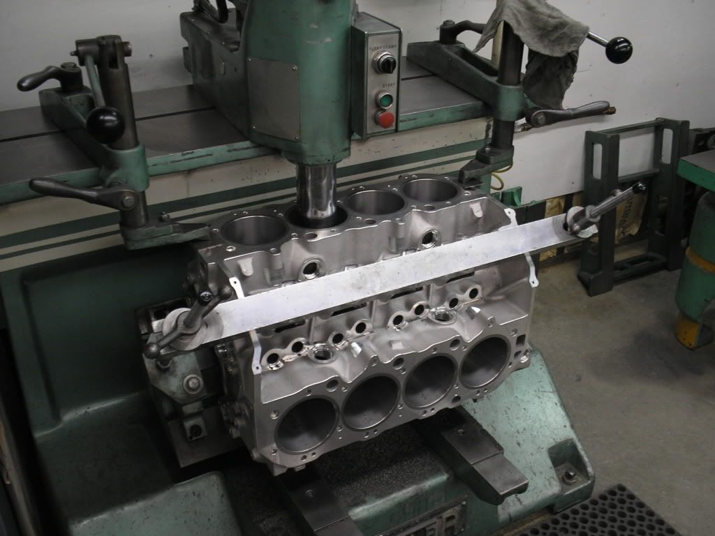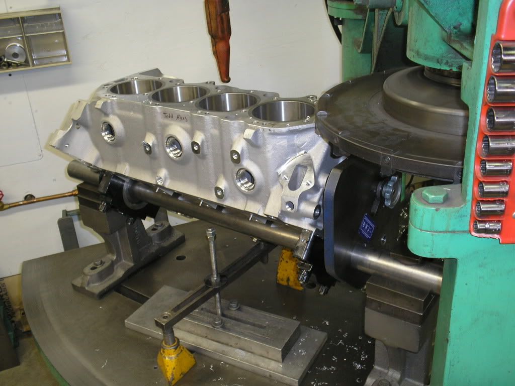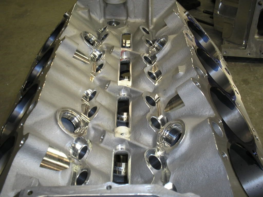 In the first two photos the block is being decked and bored. http://i200.photobucket.com/albums/a...oringblock.jpg http://i200.photobucket.com/albums/a...ckingblock.jpg The factory lifter brackets bosses have been removed so he can install screens. http://i200.photobucket.com/albums/a...thtowers-1.jpg http://i200.photobucket.com/albums/a...tingtowers.jpg |