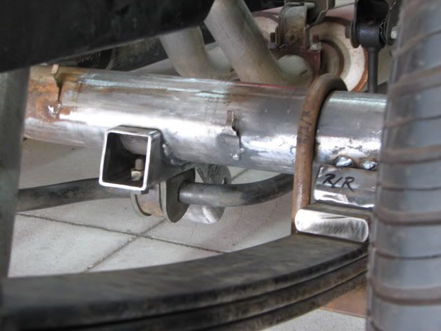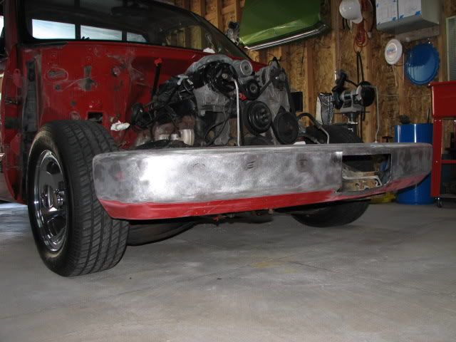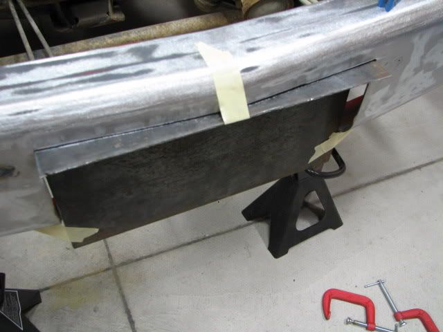 I worked on brackets for the sway bar last week end. I was also going to purchase and install a smooth front bumper w/recessed license plate, but decided to just smooth mine and recess the plate. Saves me a couple of bills, and I don't have to store the old one. Here are a few pictures.