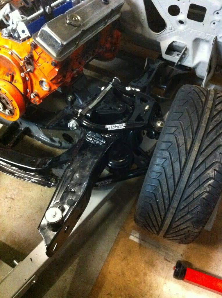 Subframe is back under it with the DSE Body mounts i dropped in my 305 just because I had nothing better to do. Im currently debating going with a crate LS or a drop out LS motor but thats a long way away. My girlfriend has been harrassing me about the pile of boxes in the entry way at home and txt me pictures of all of them. So when i get back from my current training trip next weekend ill be able to fully assemble my front suspension and get the front back on the ground. The AME Tri-4bar should be done soon, I need to give Prodigy a call and check the status. Hopefully i can get the car back on the ground before January Ill get some more pics up soon http://i987.photobucket.com/albums/a...o/2621ae57.jpg http://i987.photobucket.com/albums/a...o/d651efc6.jpg |