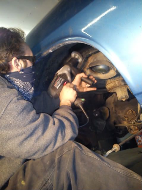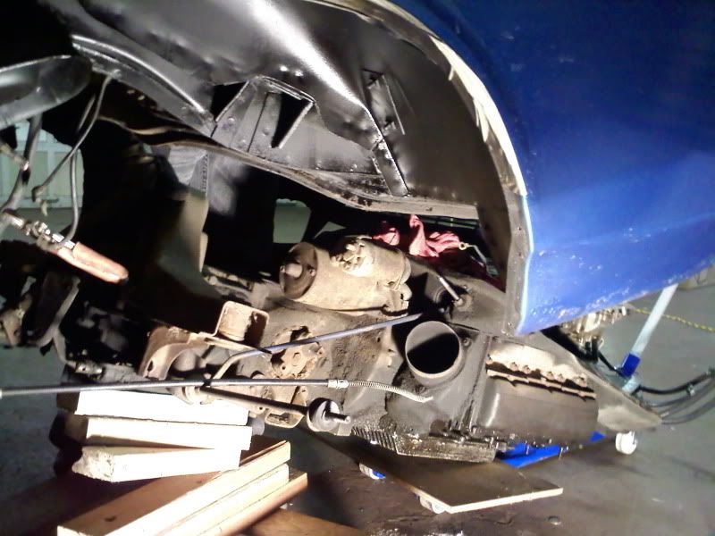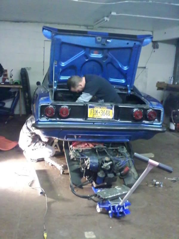 On the way out...you can also see one of the freshly painted wheel wells: http://i15.photobucket.com/albums/a3...0120022313.jpg One of the guys helping to position the motor/trans onto a dolly for easy removal: http://i15.photobucket.com/albums/a3...0120022314.jpg Almost out! http://i15.photobucket.com/albums/a3...120022314a.jpg Aaaand, there it sits: http://i15.photobucket.com/albums/a3...0120022316.jpg Next step is to finish sanding and undercoating the rear of the car now that the motor is out, as well as painting the engine bay. After that, I'll do a basic gasket rebuild of the motor and transmission, and put it back in with the new rear suspension. |