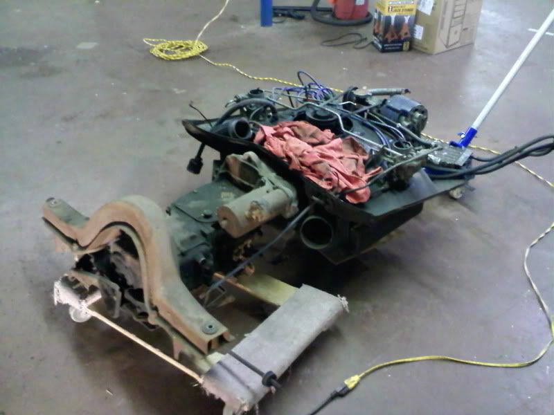 Not many photos today, but I got the drivetrain removed last night. Again, a couple of buddies came by to help out. I'll try to get some better photos next time I'm at the shop, probably later today.