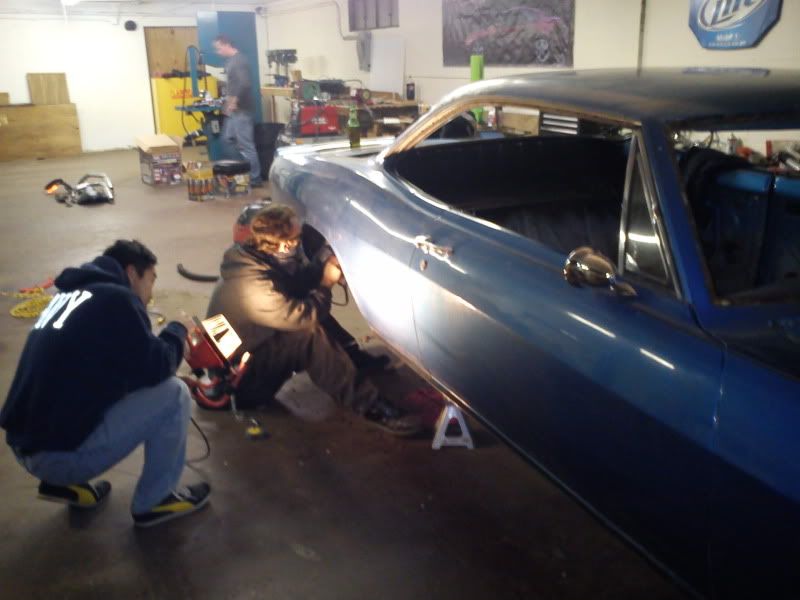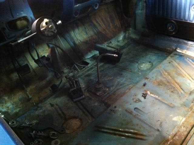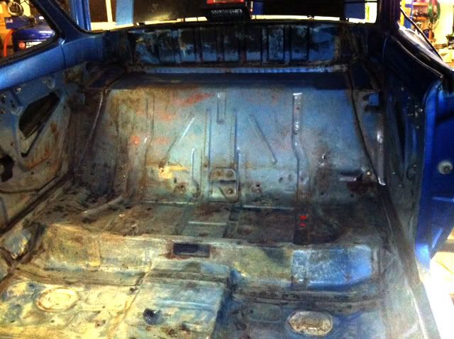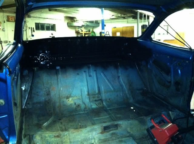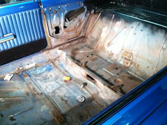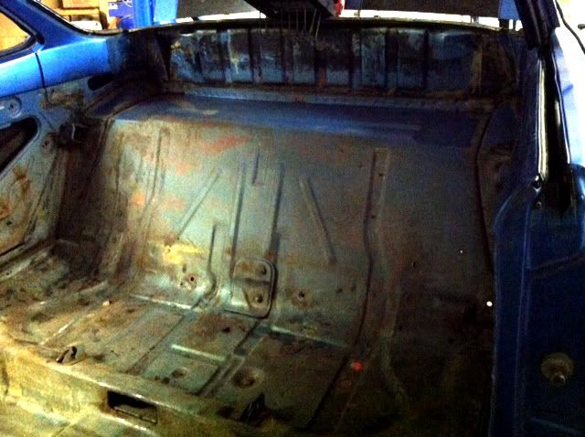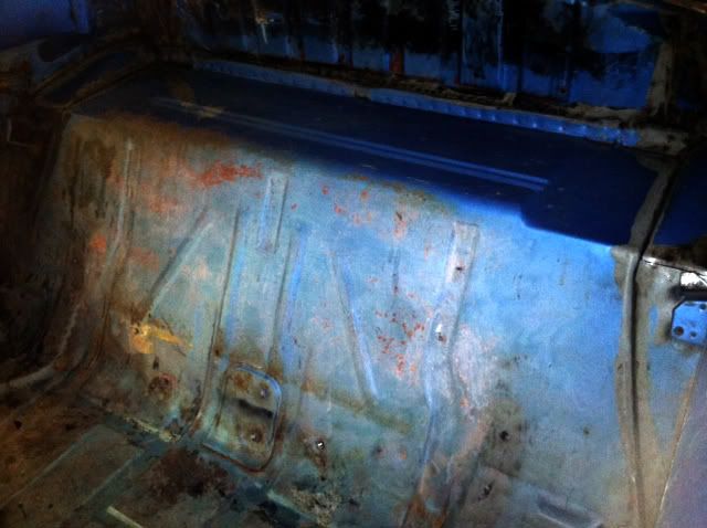 Alright, time for an update. I Unexpectedly had a few hours to work on the car today, couple of buddies came over to help with the floor too. I don't know what sort of adhesive they used in the 60's, but it's stubborn as hell. We spent hours scraping, sanding, and grinding, and got the rear half of the interior cleaned up and ready for paint: