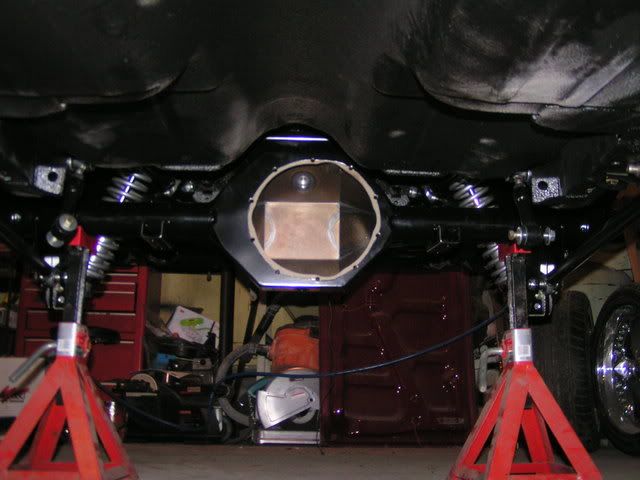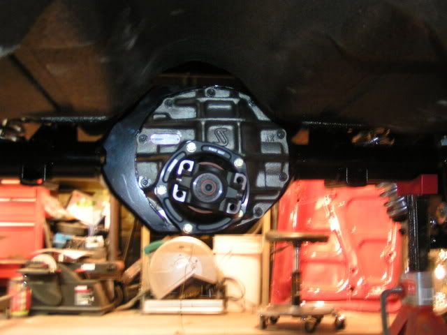 I was able to get the center section of the rear end in today. The one I'm using is a Strange pro nodular case with 3.70 gears. It has a half billet posi unit and I've upgraded to the black aluminum (nodular) pinion support with a 1350 yoke. I know I've gone overkill with this, but better not to have any weak links. I got the Moroso race anodized blue ujoint caps to go along with it.