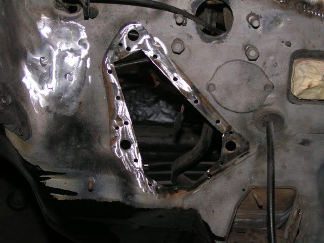 Now that I have the motor and I know that I will be using a drive by wire throttle, I decided to smooth out the throttle cable hole and the throttle pedal mounts. Two areas to smooth http://i222.photobucket.com/albums/d.../PICT00424.jpg Throttle hole smoothed http://i222.photobucket.com/albums/d.../PICT00434.jpg I posted this in the Body section also, but since this is my thread, I thought I'd post it here also. I know there are lots of great fabricators and body guys on this site, none of which would ever need any advice from a guy like me, but I thought I would share a tip a discovered today,all because I was lazy the other day. This is for anyone who had a hole in a panel that they needed to fill in with more sheet metal. I'm sure a lot of us have sat there cutting and testing, cutting and testing until finally the filler piece is the right size. Sometimes it may take several attempts, but eventually we make it. Today I was doing some more work on smoothing my firewall now that I now I will be using a drive by wire throttle. I cut out the area I wanted to smooth and started looking at the hole I had to fill trying to figure out the best way to make a template. I happened to look over on the floor and saw a roll of masking tape that I was too lazy to pick up the other day and it gave me this idea. I thought of taking pics after I had the tape on, but you'll get the point. The area I wanted to fill in was the pedal holes to the left of the steering column hole. http://i222.photobucket.com/albums/d.../PICT00424.jpg Once you have the hole cut, cover the entire hole with masking tape. http://i222.photobucket.com/albums/d.../PICT00445.jpg I used an exacto knife to cut along the sides of the hole http://i222.photobucket.com/albums/d.../PICT00454.jpg I then stuck the newly cut piece of tape to some sheet metal giving me my template http://i222.photobucket.com/albums/d.../PICT00465.jpg If you cut it along the side of the tape, it will be the about the same size of the hole. Since I wanted to butt weld it, I cut a little smaller than the tape http://i222.photobucket.com/albums/d.../PICT00474.jpg Take the tape off and you have your patch http://i222.photobucket.com/albums/d.../PICT00484.jpg Tack it into place. The nice thing about trimming a bit smaller than the tape was it left me nice gap to fill in with weld http://i222.photobucket.com/albums/d.../PICT00493.jpg Finish your welding http://i222.photobucket.com/albums/d.../PICT00503.jpg And finally after some clean up http://i222.photobucket.com/albums/d.../PICT00515.jpg I'm also going to smooth out the two mounting holes for the emergency brake. I'm going to fab something up to mount the new Lokar unit when I get it. I had smoothed it out, but forgot to take my camera back to the shop with me so will post pics later. These will be filled in http://i222.photobucket.com/albums/d.../PICT00523.jpg |
