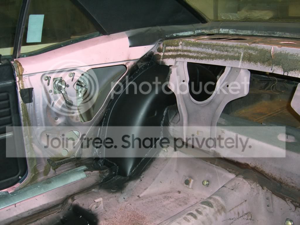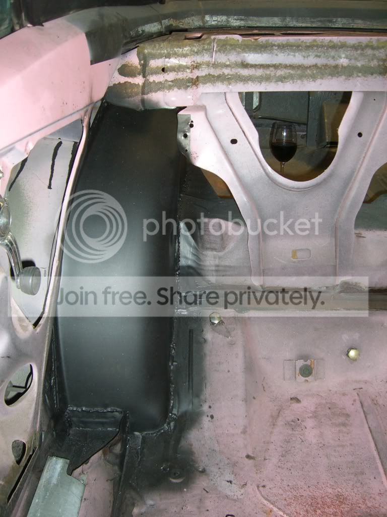Well, I still need to seam seal everything, but I think I'm going to wait until after I finish the rear suspension install and seam seal the whole shootin match at once. The black stuff is Eastwood "Rust Encapsulator". They said it makes a primer/sealer for underbody stuff so I went with it. I'll seam seal then cover everything in "Lizard Skin" sound/heat attenuation material. Pax side tub from the inside: http://i490.photobucket.com/albums/r...e/CIMG4003.jpg http://i490.photobucket.com/albums/r...e/CIMG3998.jpg Drivers side tub, from the outside: http://i490.photobucket.com/albums/r...e/CIMG3997.jpg Drivers side from inside the trunk. Tweaking the trunk hinge support to fit the profile of the new tub was quite a challenge. I bent, unbent and rebent each of them at least 1/2-doz times. The sheetmetal is a bit ugly just above the weld. I had to hammer the tub to fit the curvature of the cutout. I'll hit it with a little trunk spatter and if that doesn't hide the ripples I'll break out the hammer/dolly and smooth it.......I hope to not have to though. http://i490.photobucket.com/albums/r...e/CIMG3992.jpg Finished up the subframe connector as well. Welded back in the relief cut in the seat pan trimmed the body drain plug to fit, welded that in and primed the whole mess. http://i490.photobucket.com/albums/r...e/CIMG4000.jpg Next up on the hit parade.....stripping all the undercoat from the bottom of the car. This is gonna be a messy freakin job. I am not looking forward to it, but it's got to be done prior to installing the 3-link and sending it off for a cage. Thanks for watching..... |