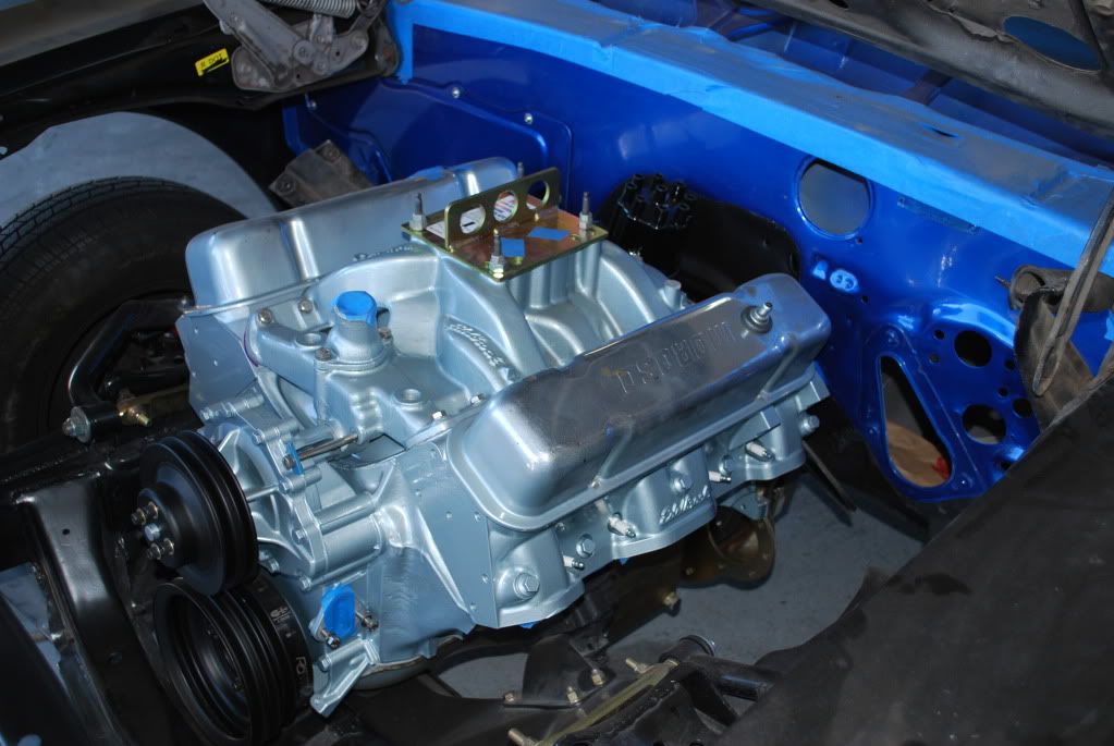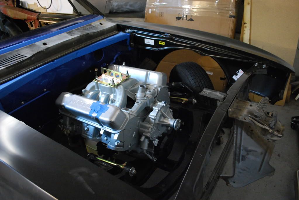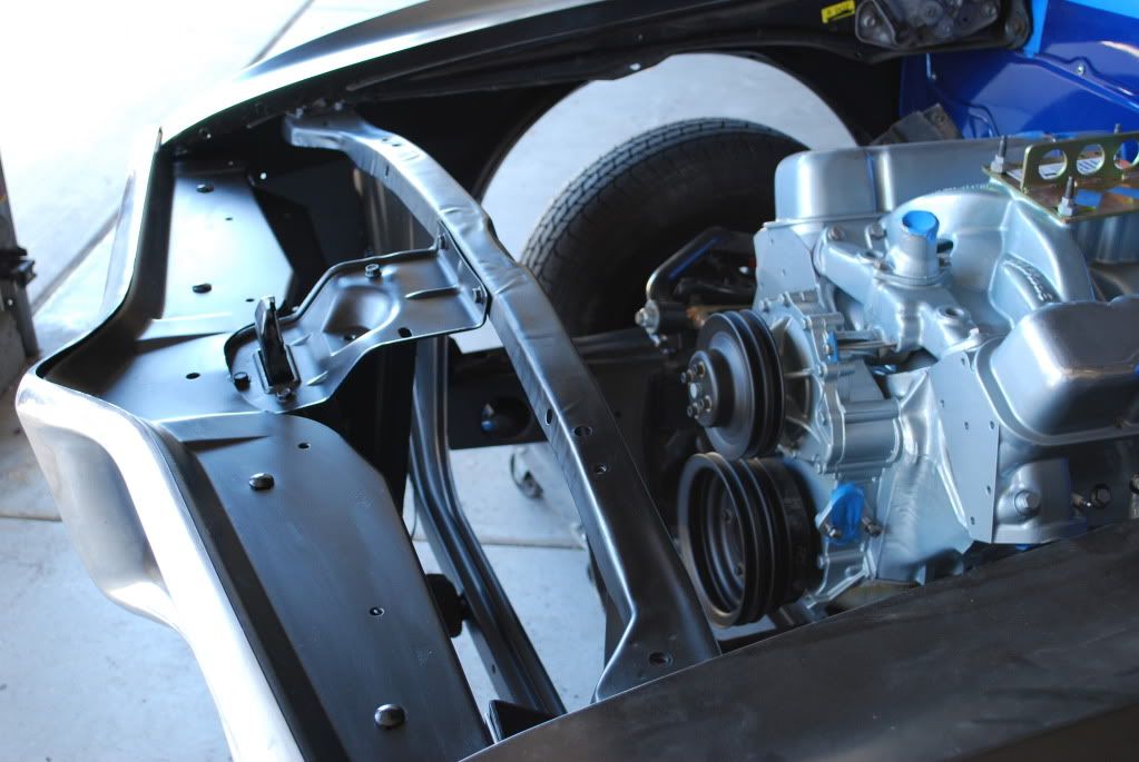Long overdue updates. The motor and trans are now in the car. I've started getting the front sheet metal bolted up, sandblasted and painted all the little brackets that are needed for that. I used Eastwood underhood black for the parts. Well, here are the pics.......
