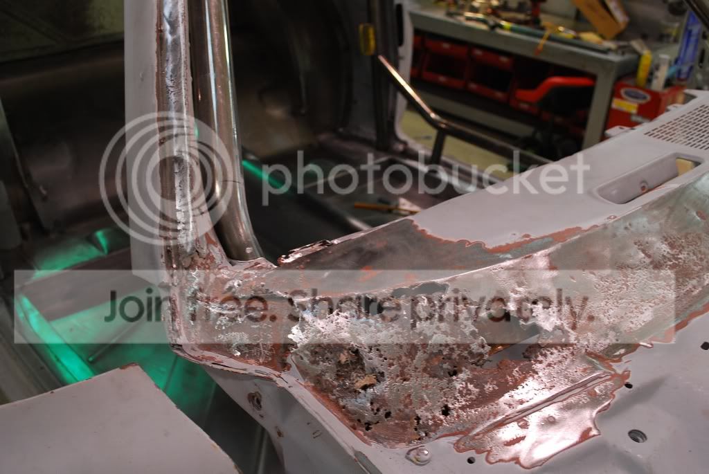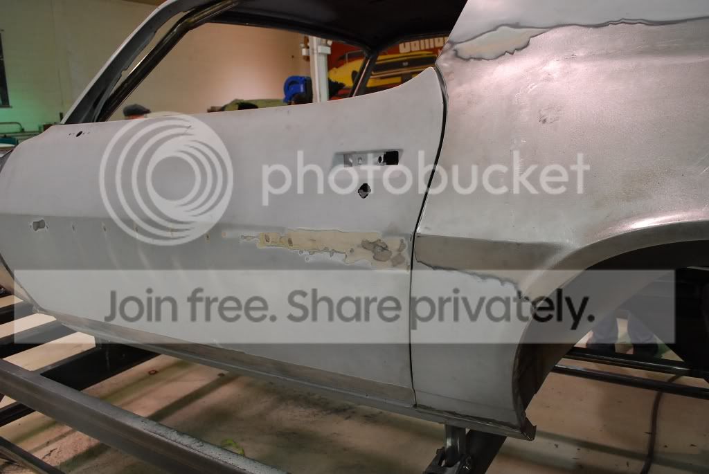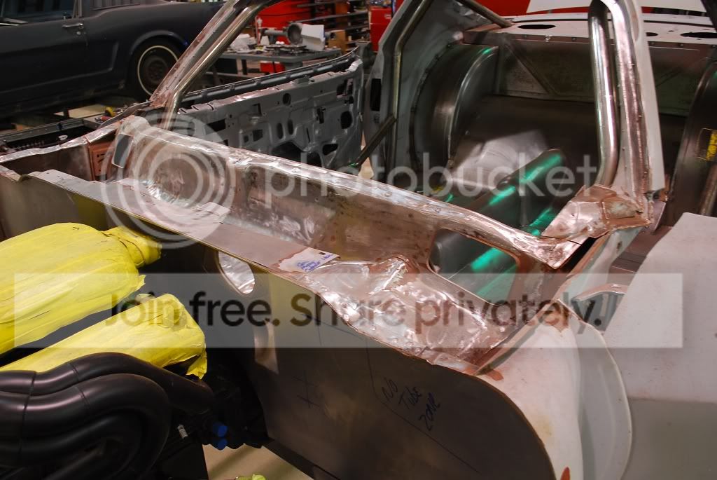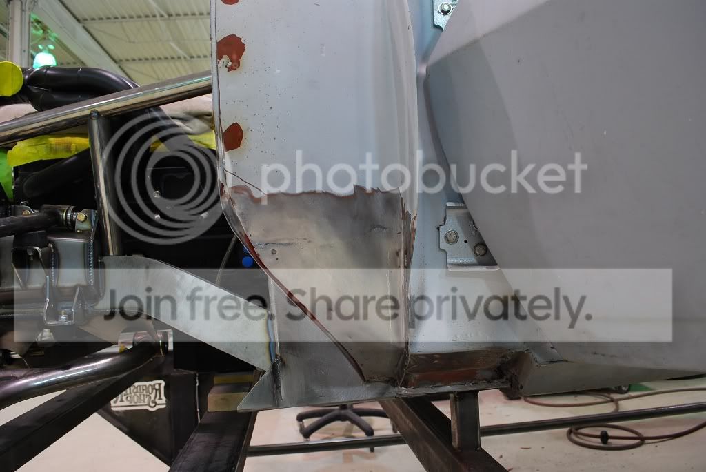 While finishing the cage, we noticed some fiberglass in the bottom of the windshield area. That was ground out to find this. http://i563.photobucket.com/albums/s...ture220388.jpg The entire top of the cowl and dash was removed and has since been blasted. http://i563.photobucket.com/albums/s...ture220414.jpg There were a few areas in the bottom of the cowl sides that needed more attention as well. http://i563.photobucket.com/albums/s...ture220428.jpg When we started lining up the doors, we found that the driver door was packed with mud. http://i563.photobucket.com/albums/s...ture220453.jpg That door wasn't salvageable so we re-skinned it. the passenger door wasn't as bad and we were able to metal finish it out. http://i563.photobucket.com/albums/s...ture220549.jpg There were a few other small spots around the car that needed attention. We would normally blast the car down to bare metal before beginning any work, but were told that the car was in perfect condition, and just primed to prevent rust. We took the guys word and never really looked into anything too closely to inspect it until now, and found a few surprises. |