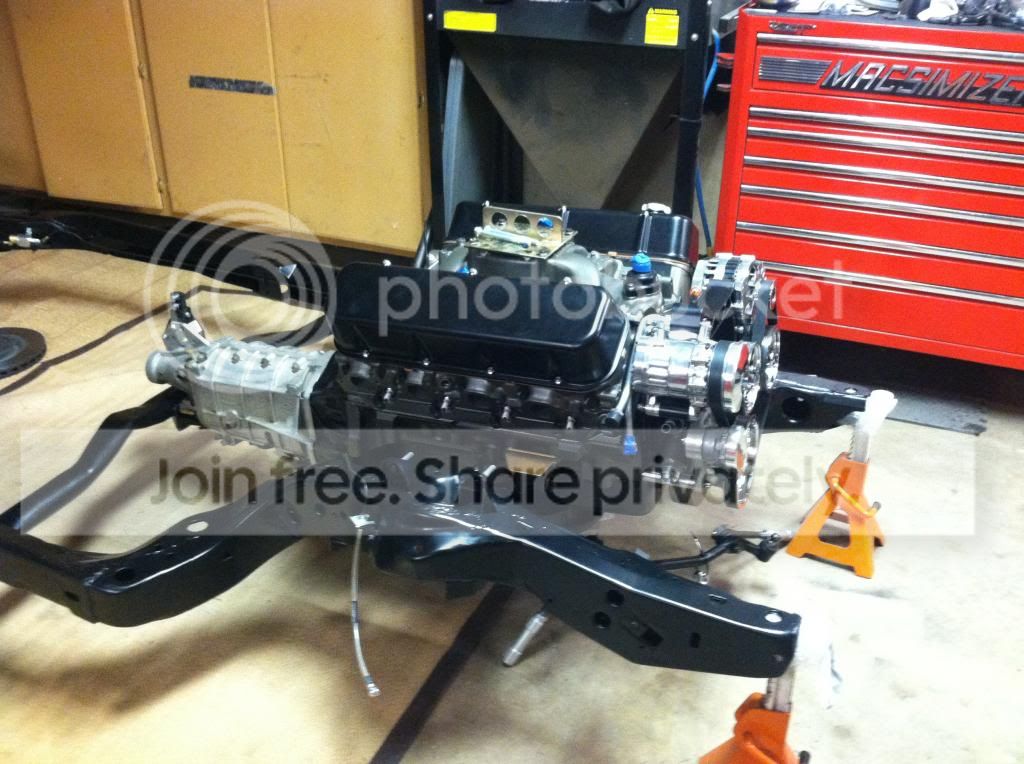Got the engine/trans in the frame last weekend. I also finished all of the Lizard Skin application of the inside and outside panels. That stuff is amazing and super easy to apply. Once we paint the firewall this weekend and hang the suspension on from Ridetech, the body will be ready to go back on. I'm getting pretty excited!