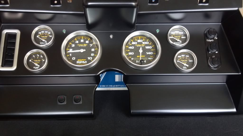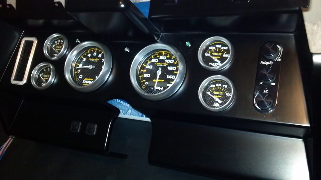 This week got the trunk and interior sprayed with Raptor Liner, fabed up brackets to mount the electric fuel pump and the Vintage Air unit. Also finishing up the fuel and brake lines. I picked up the DSE dash carrier and loaded the gauges. The VA vent surround was too shiny so I hit it with a red scotchbrite pad which got it much close to the Autometer bezels. http://i855.photobucket.com/albums/a...-48-45_166.jpg http://i855.photobucket.com/albums/a...-58-12_552.jpg |
