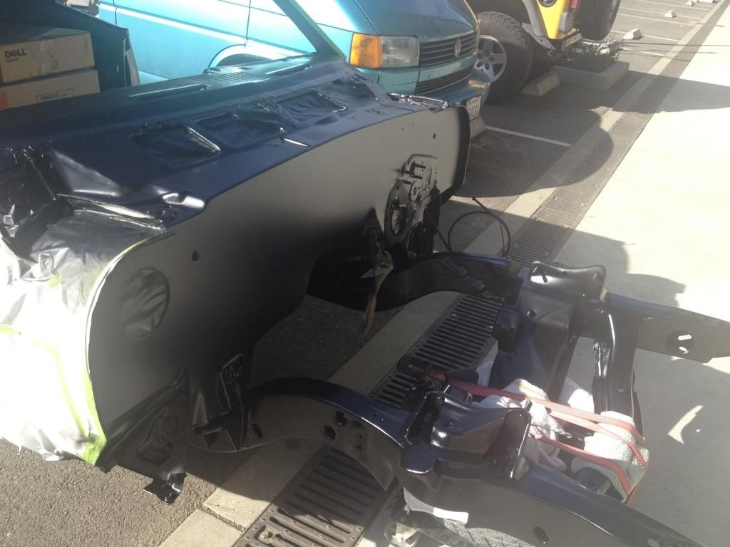 So since the color was shot they have finished the underside cleaning up the mini tub welds and detailing the underside before completing the seam sealing and shooting it with Raptor Liner. I really like this stuff since it is textured but not rough like many bedliners. Chris also had his guys clean up the weld on the subframe. He went way beyond by basically rewelding the whole thing. Here you can see some of the clean up stuff he did. The pics don't do it justice. They look way better and a whole lot cleaner. http://i855.photobucket.com/albums/a...3f38c0520b.jpg http://i855.photobucket.com/albums/a...474b49df9c.jpg http://i855.photobucket.com/albums/a...9b3b0eae41.jpg Once that was all done and cleaned up it was ready to go back in the paint booth. He shoot the engine compartment, subframe, the underside of the car and the dash in Rally Matte black. It's going to look killer with the brilliant silver. Cell phone picks so they don't show too much detail. I will get some better pics next time I'm up there. http://i855.photobucket.com/albums/a...6472d5ef70.jpg http://i855.photobucket.com/albums/a...6154be0dab.jpg http://i855.photobucket.com/albums/a...ef69558b19.jpg We are very close to assembly :D |